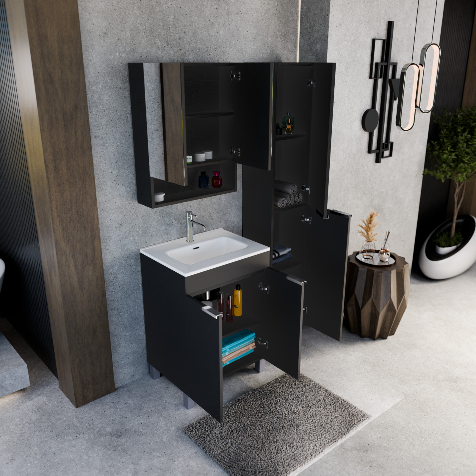 • matt fekete mosdószekrény, kivehető polccal