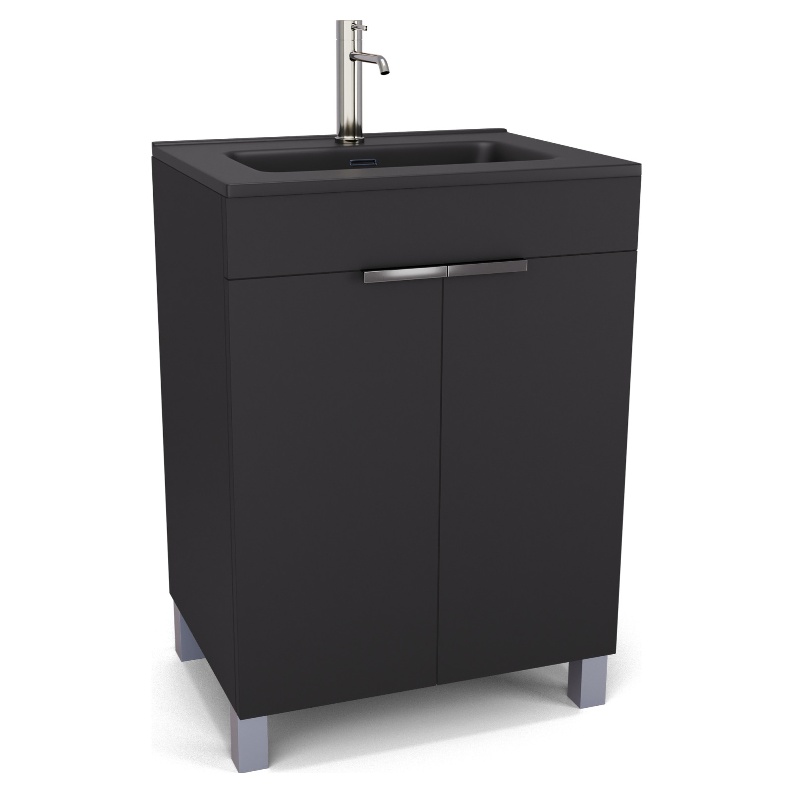Saját márkás 60 cm széles álló mosdószekrény matt fekete színben, fényes króm fogantyúkkal és lábakkal, fekete slim mosdóval, soft-close zsanérokkal ellátva.
