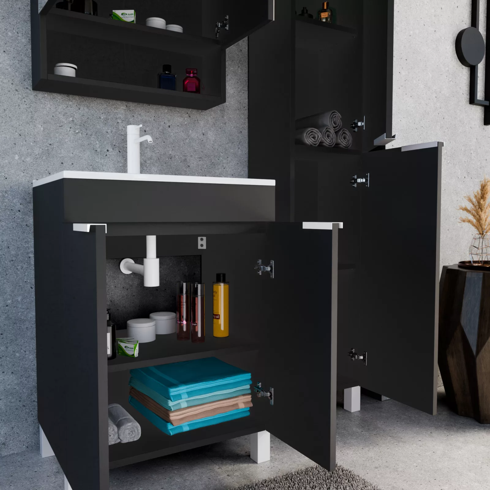 Napjainkban a praktikum mellett a fürdőszoba esztétikus megjelenése is fontos szempont. A lábon álló bútorok egyre elterjedtebbé válnak, mivel számos előnnyel rendelkeznek, ide sorolható a modern, könnyed megjelenés és az egyszerű tisztítás. A lábon álló fürdőszobai bútorok a klasszikus és modernebb stílusú fürdőszobákban is megállják a helyüket egyaránt. Nagyfokú rugalmasság jellemzi őket, mivel szinte bárhol elhelyezhetők a fürdőszobán belül. További előnyük, hogy soft close (csillapítós) zsanérral felszereltek, így  becsukáskor az ajtó vagy fiók finoman záródik be, csökkentve a terhelést és növelve az élettartamot. A szekrény fehér és matt fekete mosdóval, illetve mosdópulttal is szabadon kombinálható ízlés szerint. A teljesség érdekében a mosdószekrényekhez illő tükrös szekrényt és magas szekrényt is választhatunk, hogy a fürdőszobában lévő bútorok egy szemet gyönyörködtető egységet alkossanak.