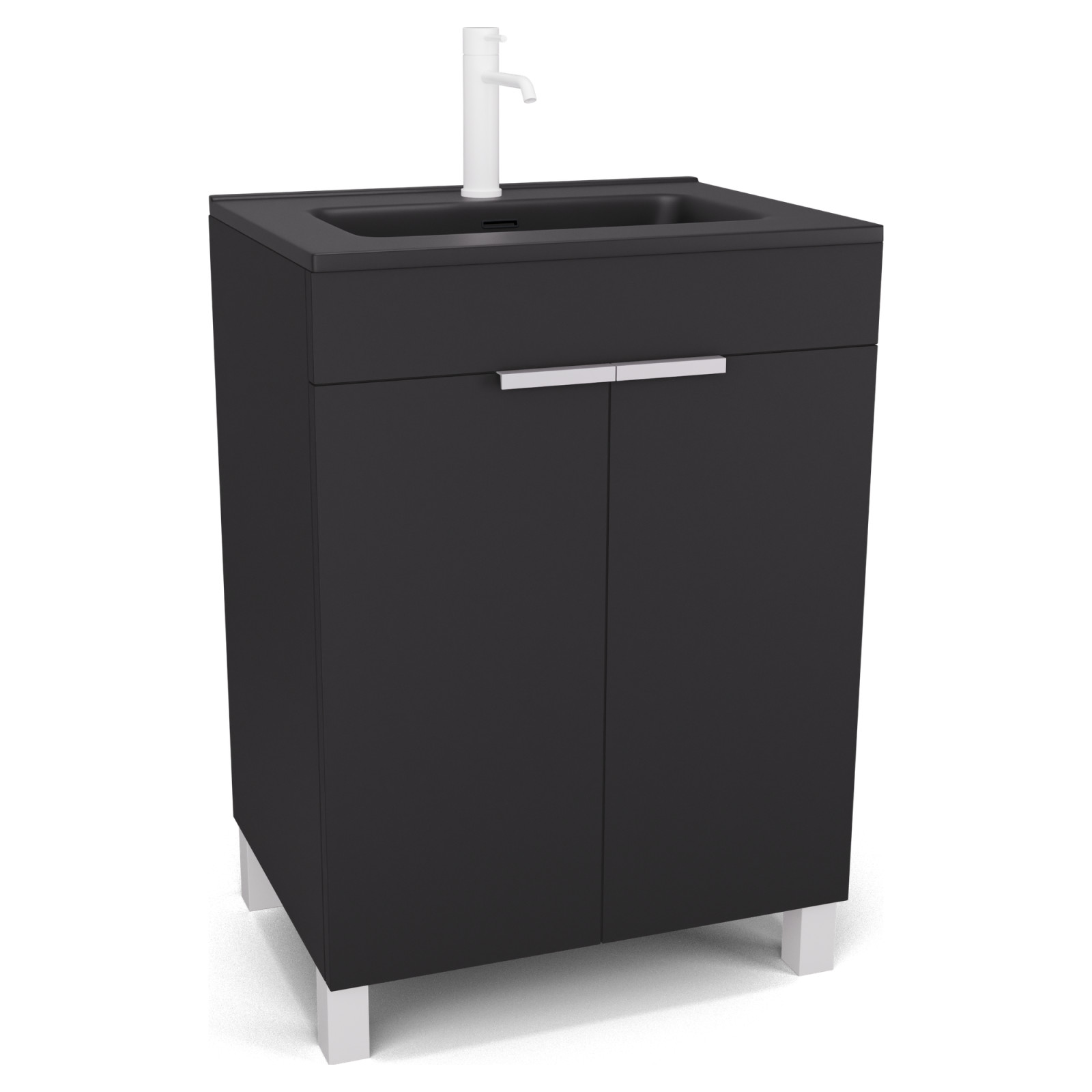 Saját márkás 60 cm széles álló mosdószekrény matt fekete színben, matt fehér fogantyúkkal és lábakkal, fekete slim mosdóval, soft-close zsanérokkal ellátva.