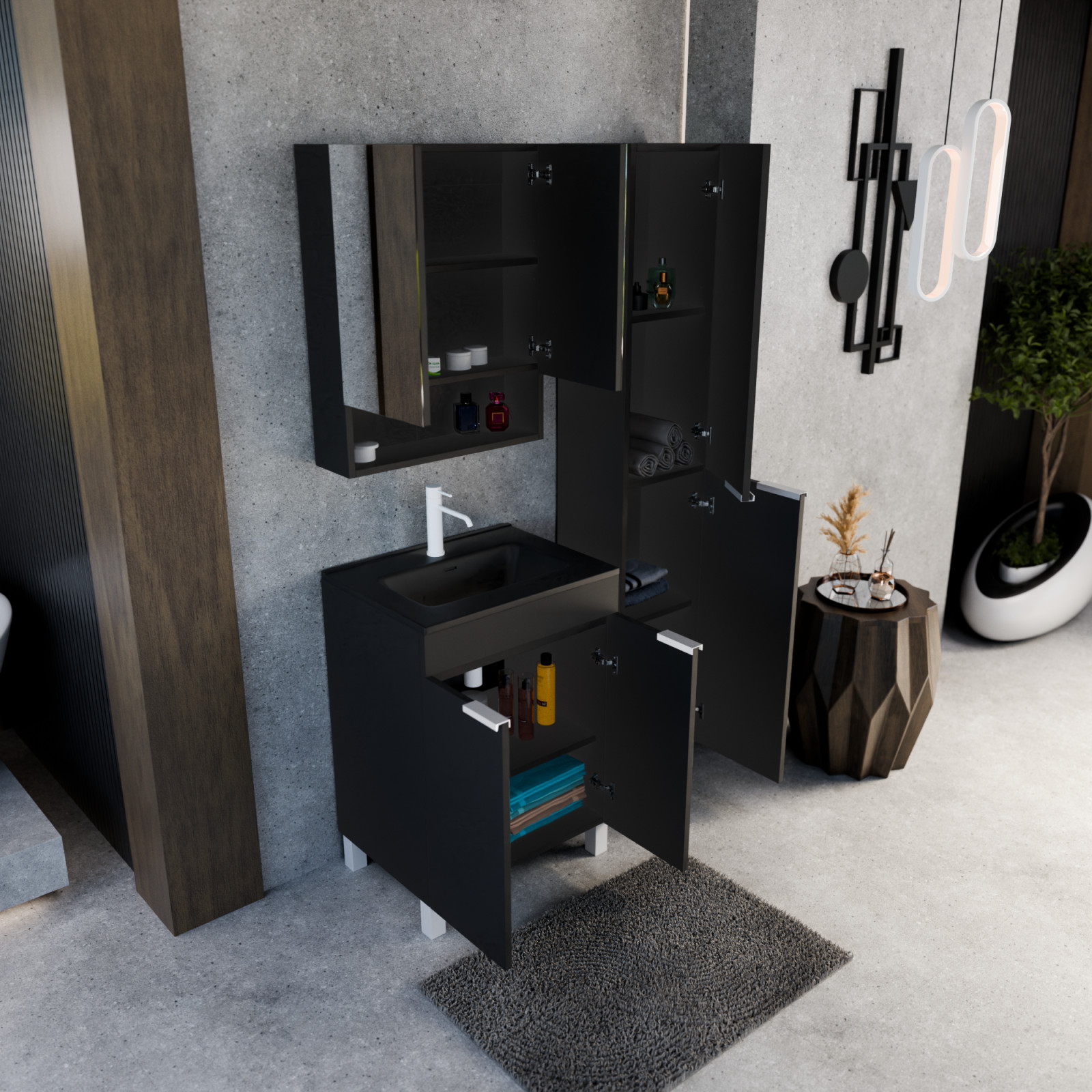 Napjainkban a praktikum mellett a fürdőszoba esztétikus megjelenése is fontos szempont. A lábon álló bútorok egyre elterjedtebbé válnak, mivel számos előnnyel rendelkeznek, ide sorolható a modern, könnyed megjelenés és az egyszerű tisztítás. A lábon álló fürdőszobai bútorok a klasszikus és modernebb stílusú fürdőszobákban is megállják a helyüket egyaránt. Nagyfokú rugalmasság jellemzi őket, mivel szinte bárhol elhelyezhetők a fürdőszobán belül. További előnyük, hogy soft close (csillapítós) zsanérral felszereltek, így  becsukáskor az ajtó vagy fiók finoman záródik be, csökkentve a terhelést és növelve az élettartamot. A szekrény fehér és matt fekete mosdóval, illetve mosdópulttal is szabadon kombinálható ízlés szerint. A teljesség érdekében a mosdószekrényekhez illő tükrös szekrényt és magas szekrényt is választhatunk, hogy a fürdőszobában lévő bútorok egy szemet gyönyörködtető egységet alkossanak.