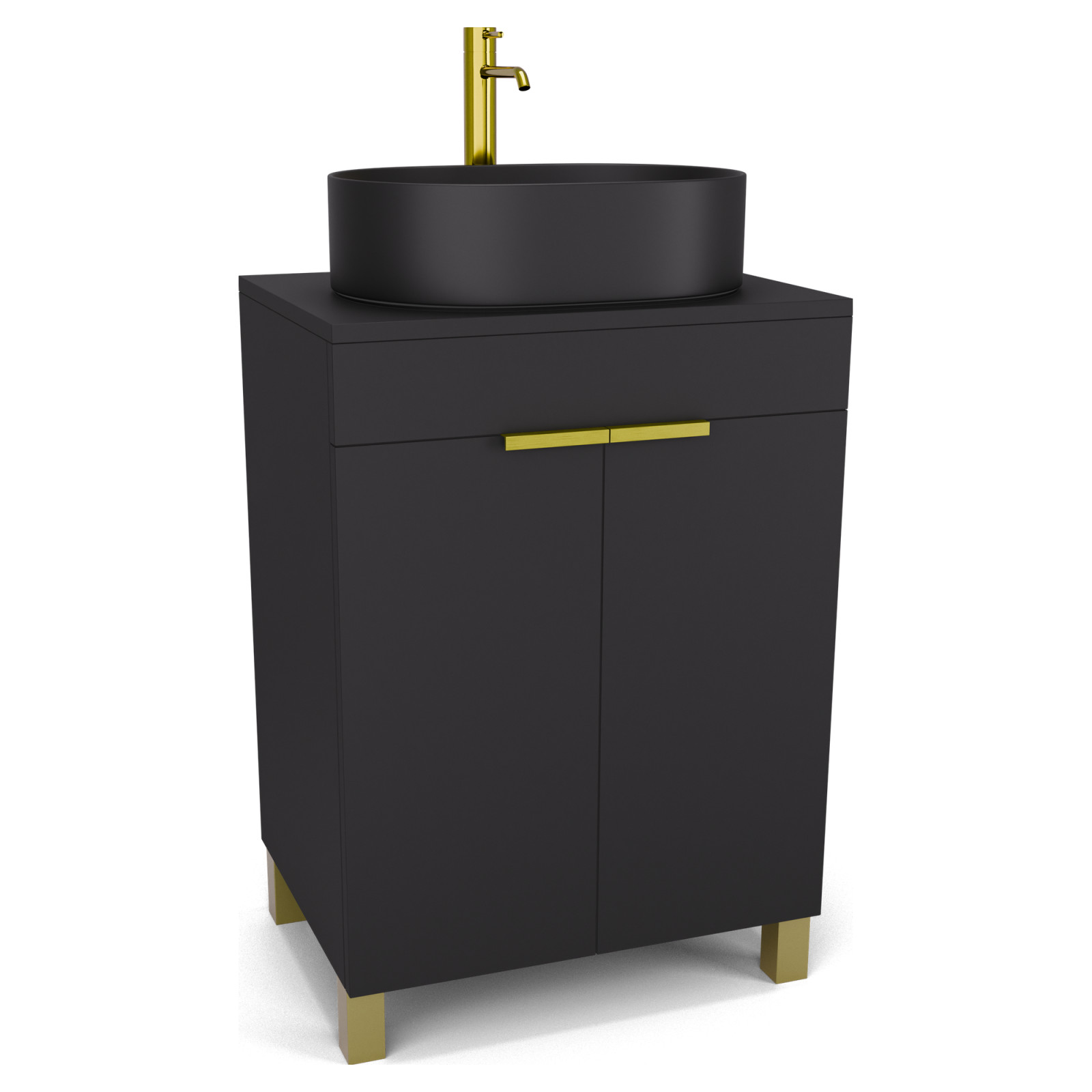 Saját márkás 60 cm széles álló mosdószekrény matt fekete színben, szálcsiszolt arany fogantyúkkal és lábakkal, matt fekete színű mosdópulttal, soft-close zsanérokkal ellátva.