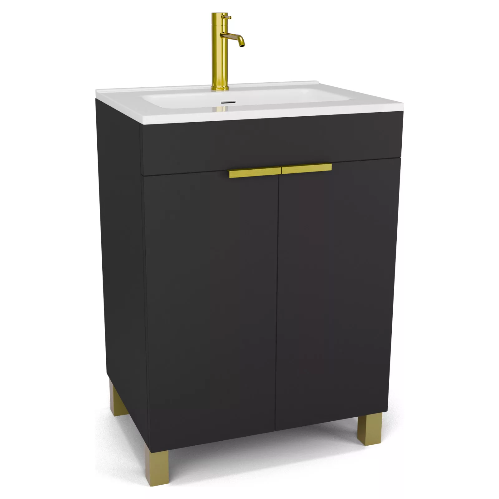 Saját márkás 60 cm széles álló mosdószekrény matt fekete színben, szálcsiszolt arany fogantyúkkal és lábakkal, fényes fehér slim mosdóval, soft-close zsanérokkal ellátva.
