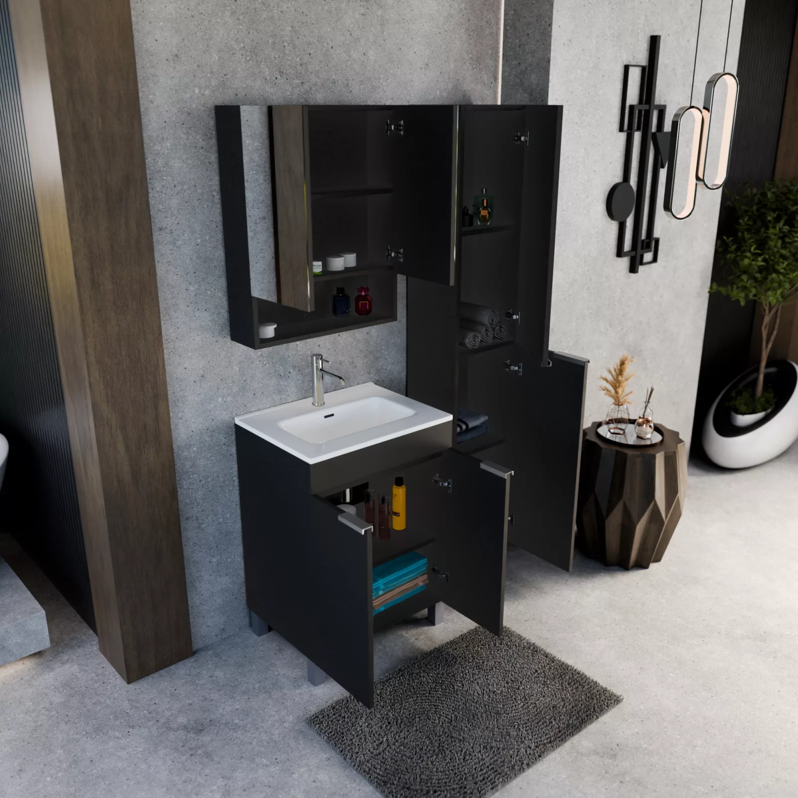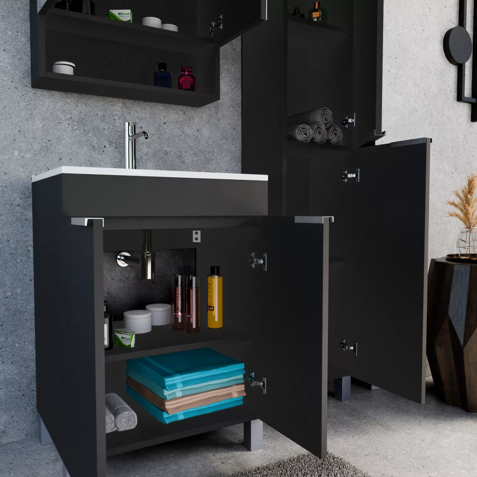 Napjainkban a praktikum mellett a fürdőszoba esztétikus megjelenése is fontos szempont. A lábon álló bútorok egyre elterjedtebbé válnak, mivel számos előnnyel rendelkeznek, ide sorolható a modern, könnyed megjelenés és az egyszerű tisztítás. A lábon álló fürdőszobai bútorok a klasszikus és modernebb stílusú fürdőszobákban is megállják a helyüket egyaránt. Nagyfokú rugalmasság jellemzi őket, mivel szinte bárhol elhelyezhetők a fürdőszobán belül. További előnyük, hogy soft close (csillapítós) zsanérral felszereltek, így  becsukáskor az ajtó vagy fiók finoman záródik be, csökkentve a terhelést és növelve az élettartamot. A szekrény fehér és matt fekete mosdóval, illetve mosdópulttal is szabadon kombinálható ízlés szerint. A teljesség érdekében a mosdószekrényekhez illő tükrös szekrényt és magas szekrényt is választhatunk, hogy a fürdőszobában lévő bútorok egy szemet gyönyörködtető egységet alkossanak.