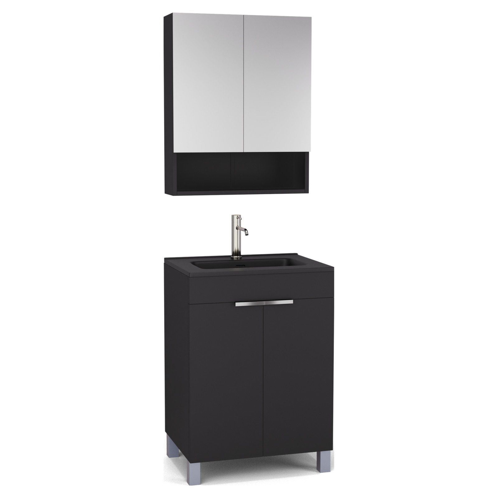 Saját márkás 60 cm széles komplett fürdőszoba bútor álló mosdószekrénnyel matt fekete színben, fényes króm fogantyúkkal és lábakkal, fekete slim mosdóval és fali tükrös szekrénnyel.