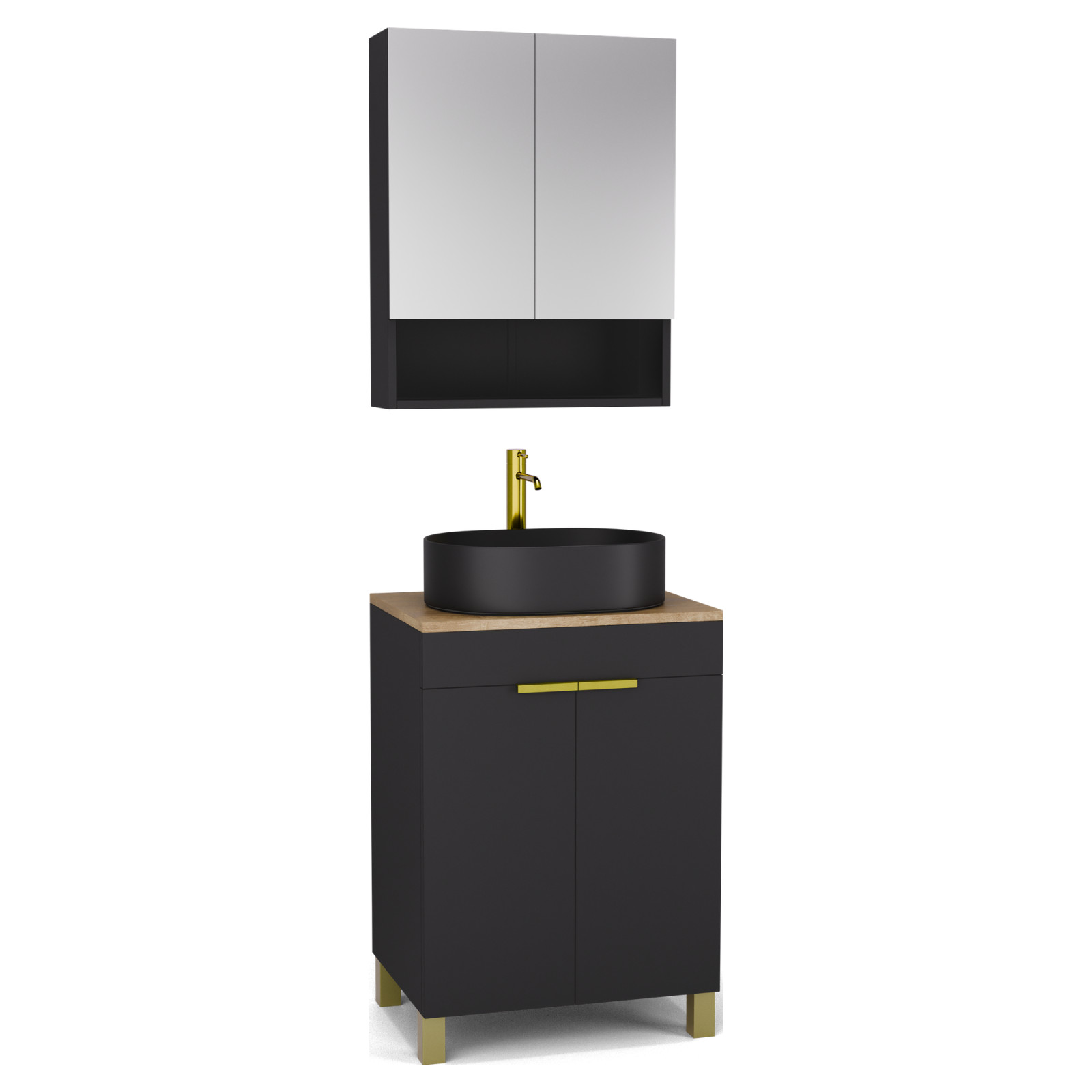 Saját márkás 60 cm széles komplett fürdőszoba bútor álló mosdószekrénnyel matt fekete színben, szálcsiszolt arany fogantyúkkal és lábakkal, tölgyfa színű mosdópulttal és fali tükrös szekrénnyel.
