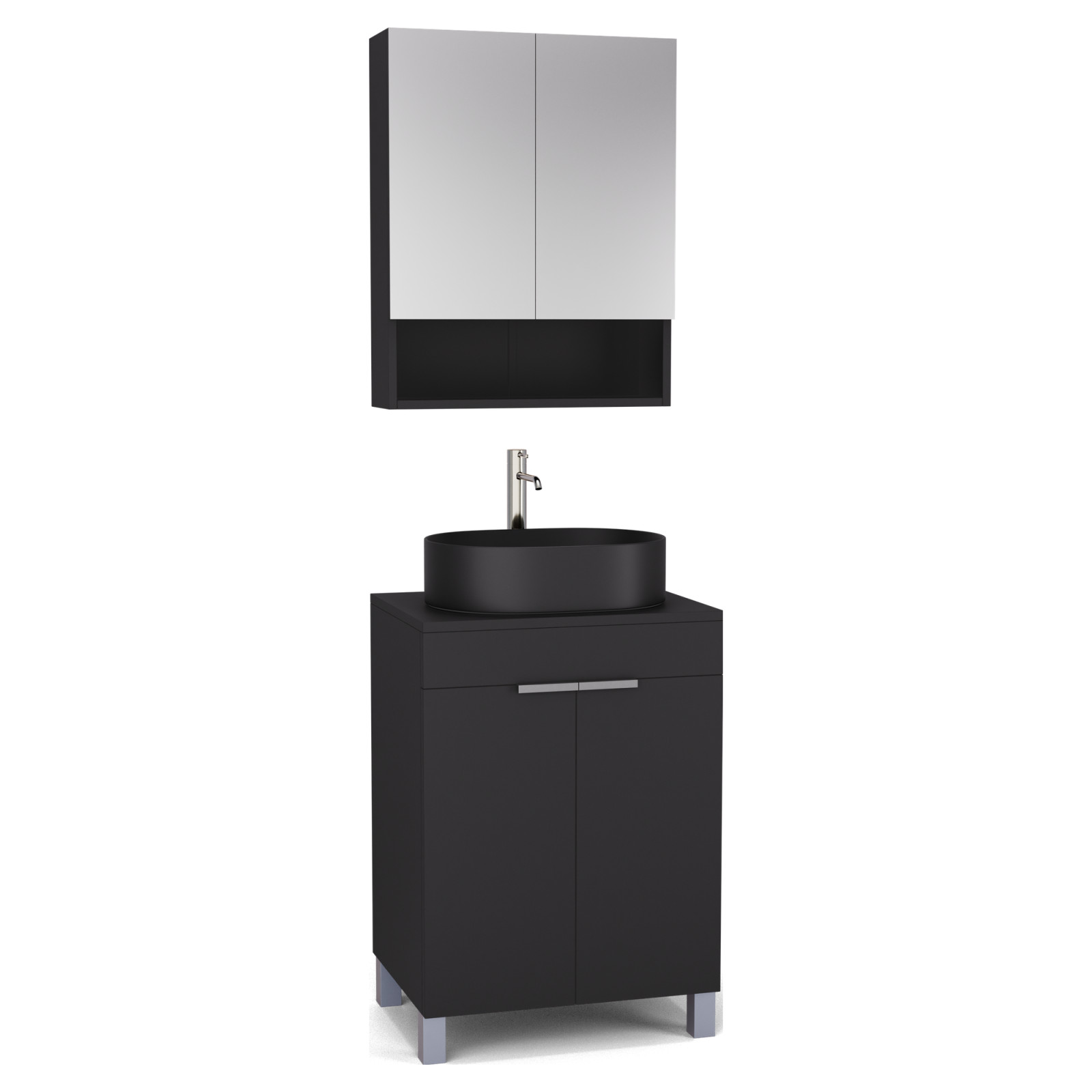Saját márkás 60 cm széles komplett fürdőszoba bútor álló mosdószekrénnyel matt fekete színben, szálcsiszolt króm fogantyúkkal és lábakkal, matt fekete színű mosdópulttal és fali tükrös szekrénnyel.