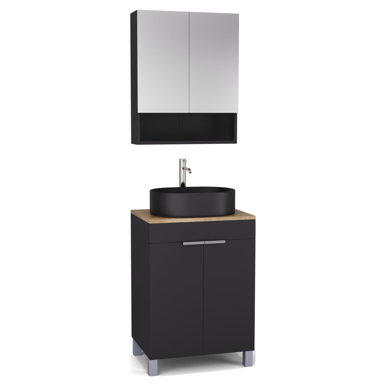 Saját márkás 60 cm széles komplett fürdőszoba bútor álló mosdószekrénnyel matt fekete színben, szálcsiszolt króm fogantyúkkal és lábakkal, tölgyfa színű mosdópulttal és fali tükrös szekrénnyel.