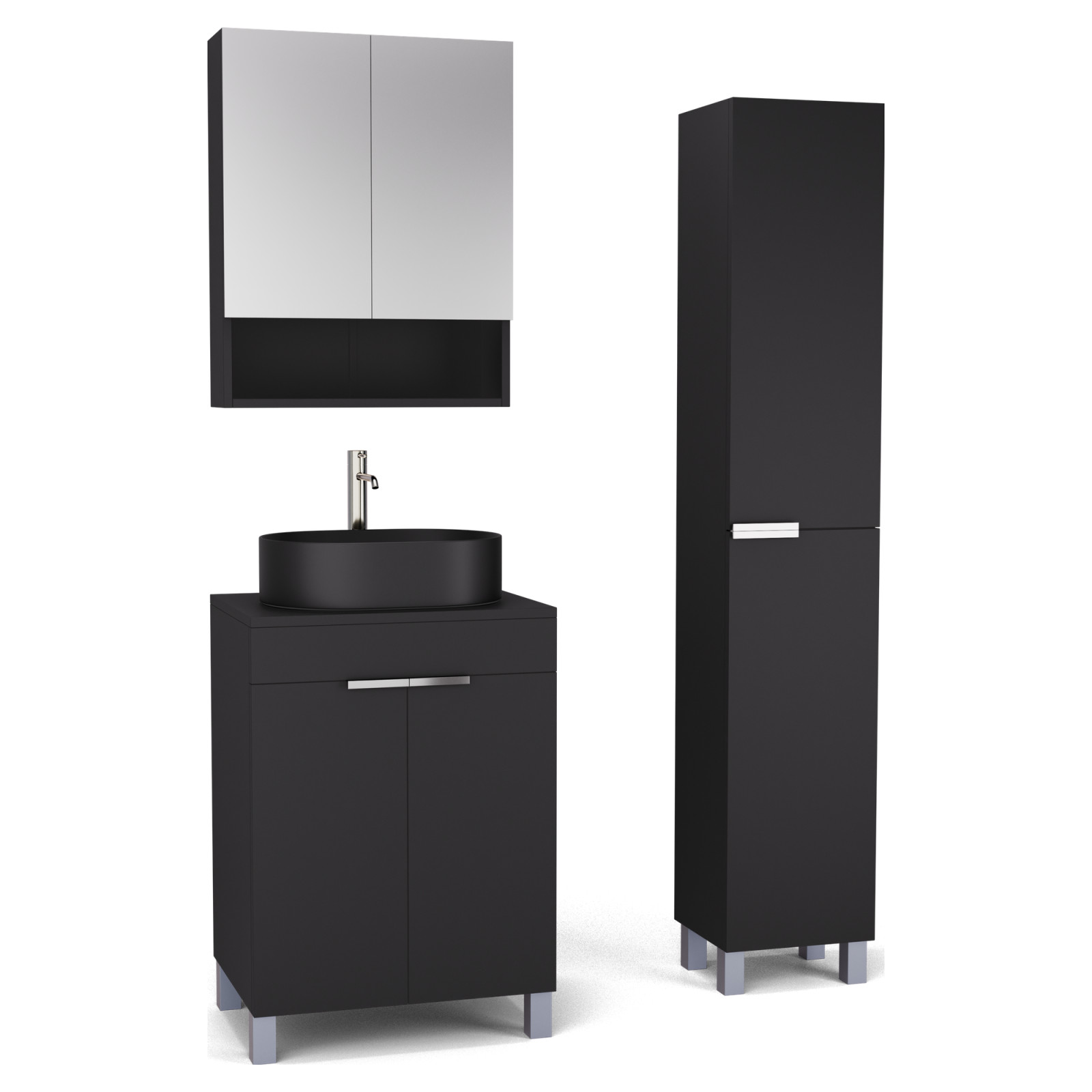 Saját márkás 60 cm széles komplett fürdőszoba bútor álló mosdószekrénnyel matt fekete színben, fényes króm fogantyúkkal és lábakkal, matt fekete színű mosdópulttal, tükrös szekrénnyel és magasszekrénnyel.