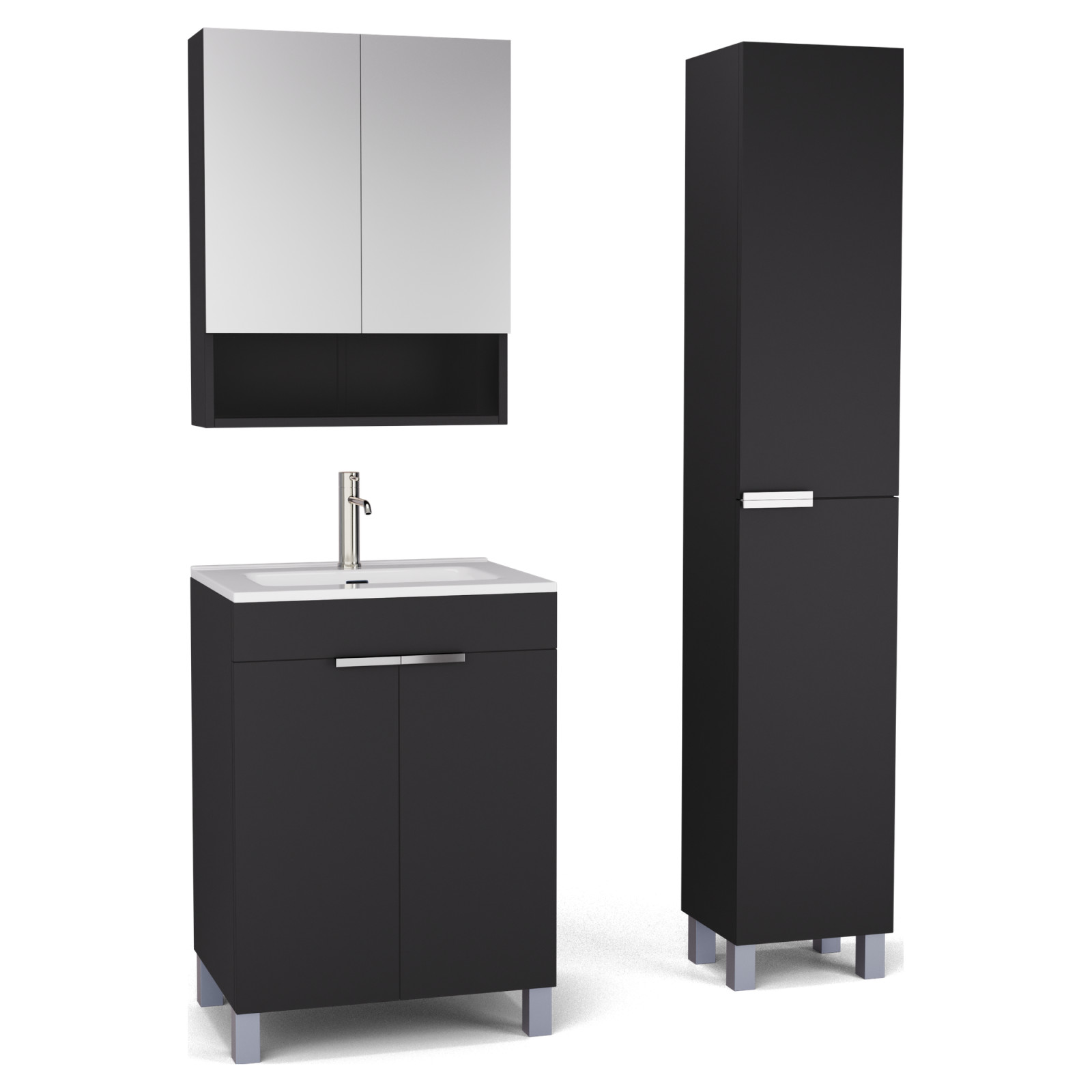Saját márkás 60 cm széles komplett fürdőszoba bútor álló mosdószekrénnyel matt fekete színben, fényes króm fogantyúkkal és lábakkal, tükrös szekrénnyel és magasszekrénnyel.