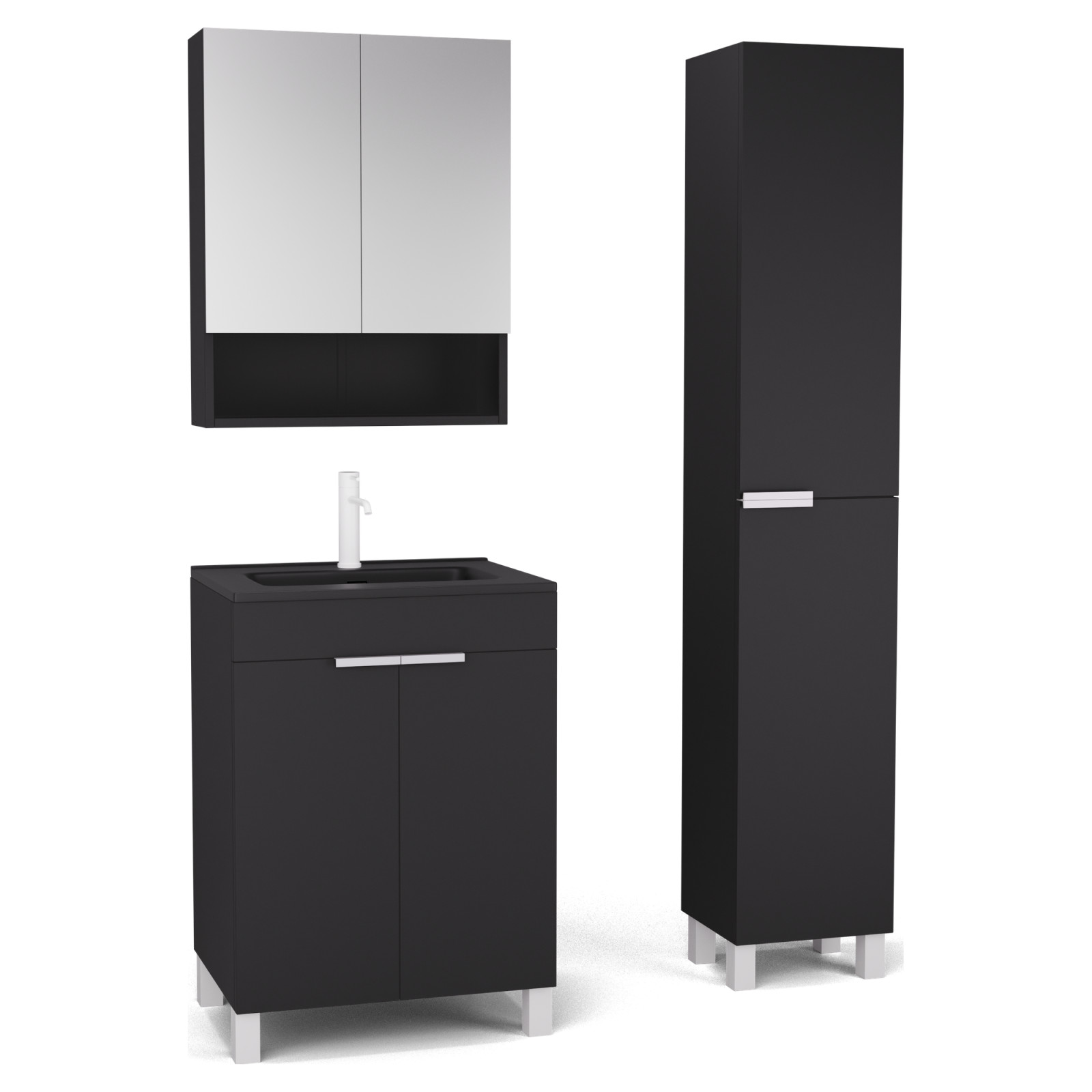 Saját márkás 60 cm széles komplett fürdőszoba bútor álló mosdószekrénnyel matt fekete színben, matt fehér fogantyúkkal és lábakkal, tükrös szekrénnyel és magasszekrénnyel.