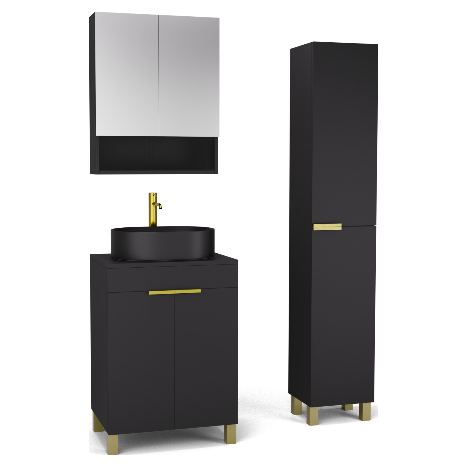 Saját márkás 60 cm széles komplett fürdőszoba bútor álló mosdószekrénnyel matt fekete színben, szálcsiszolt arany fogantyúkkal és lábakkal, matt fekete színű mosdópulttal, tükrös szekrénnyel és magasszekrénnyel.