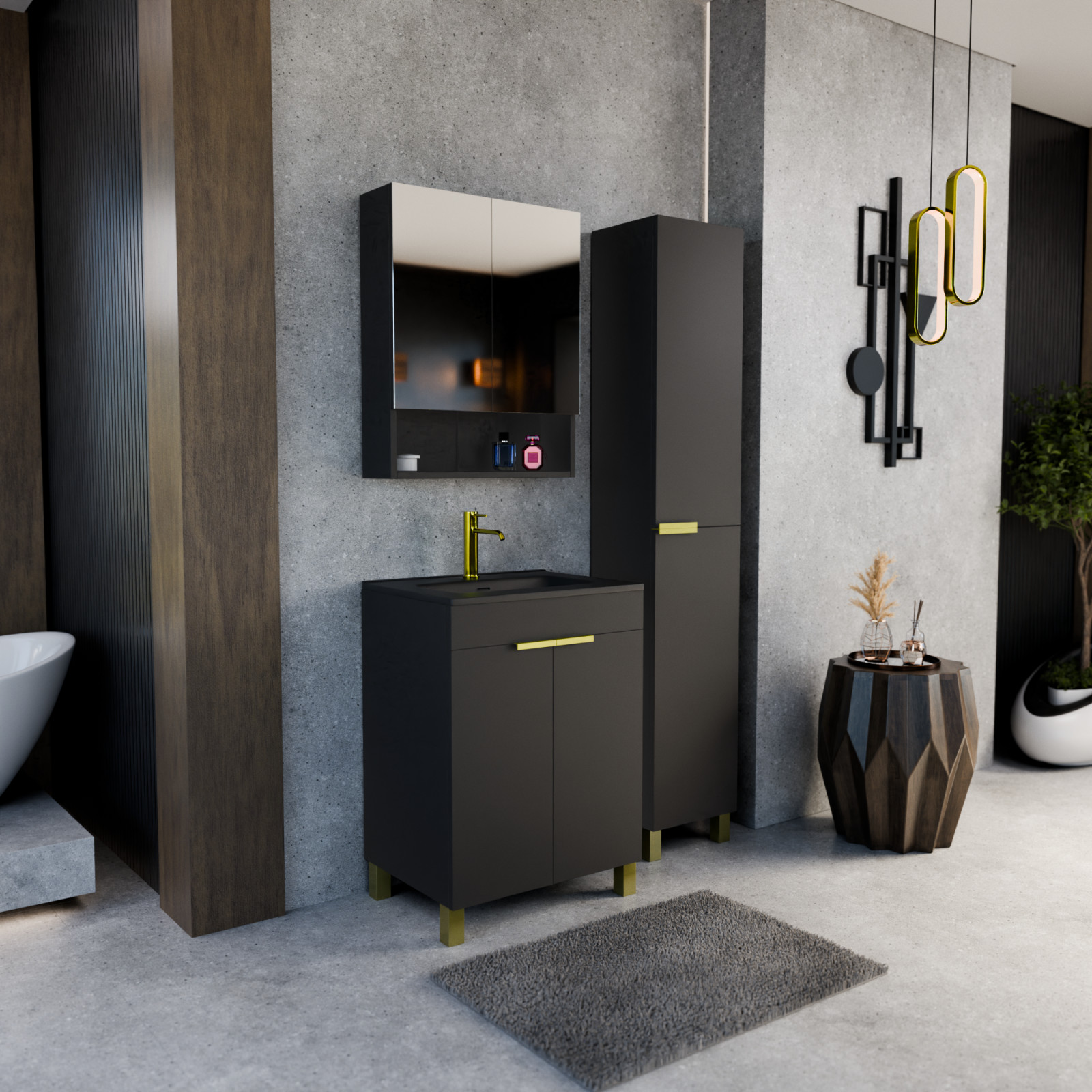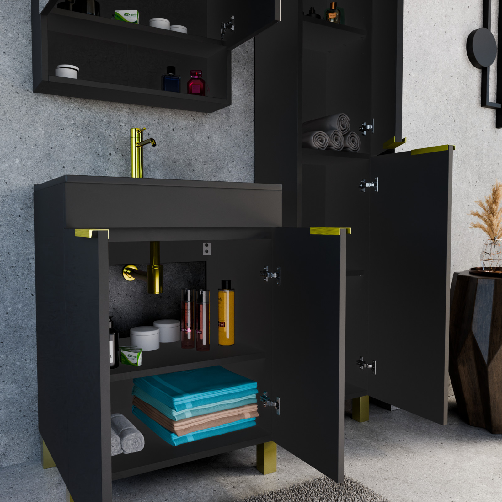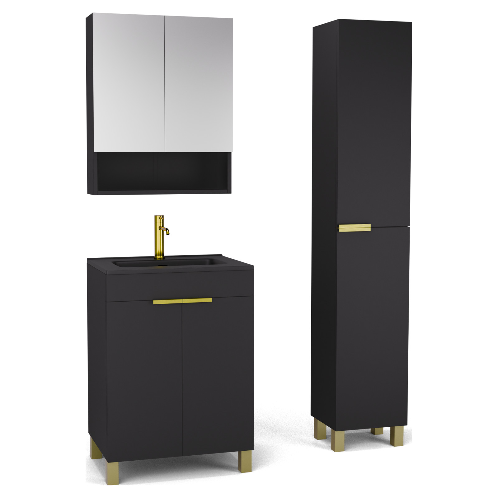 Saját márkás 60 cm széles komplett fürdőszoba bútor álló mosdószekrénnyel matt fekete színben, szálcsiszolt arany fogantyúkkal és lábakkal, tükrös szekrénnyel és magasszekrénnyel.