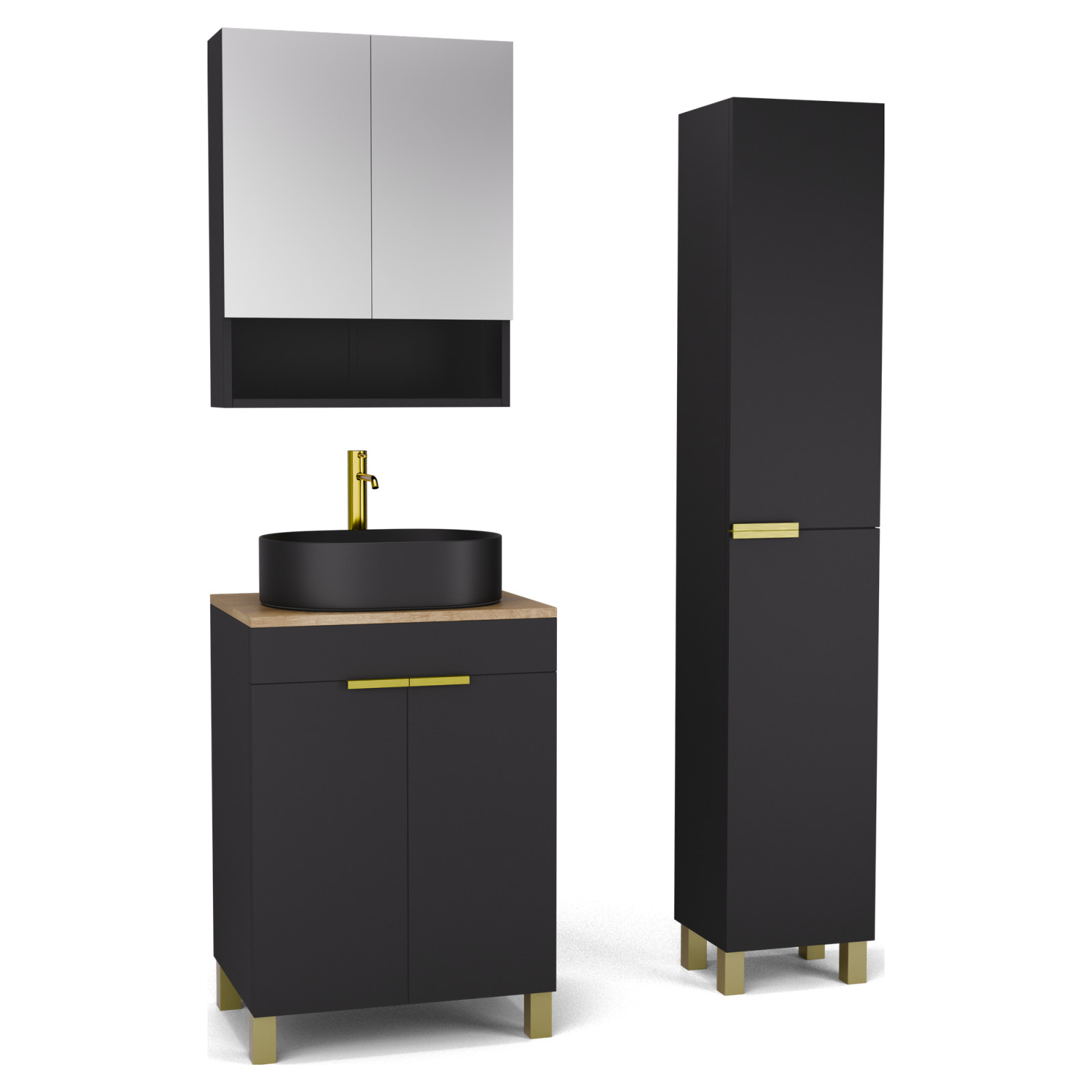 Saját márkás 60 cm széles komplett fürdőszoba bútor álló mosdószekrénnyel matt fekete színben, szálcsiszolt arany fogantyúkkal és lábakkal, tölgyfa színű mosdópulttal, tükrös szekrénnyel és magasszekrénnyel.