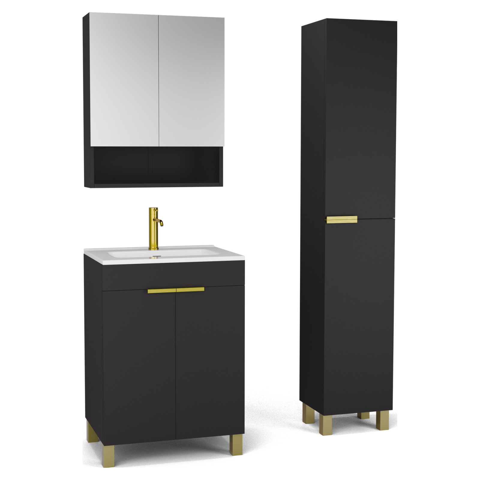 Saját márkás 60 cm széles komplett fürdőszoba bútor álló mosdószekrénnyel matt fekete színben, szálcsiszolt arany fogantyúkkal és lábakkal, tükrös szekrénnyel és magasszekrénnyel.