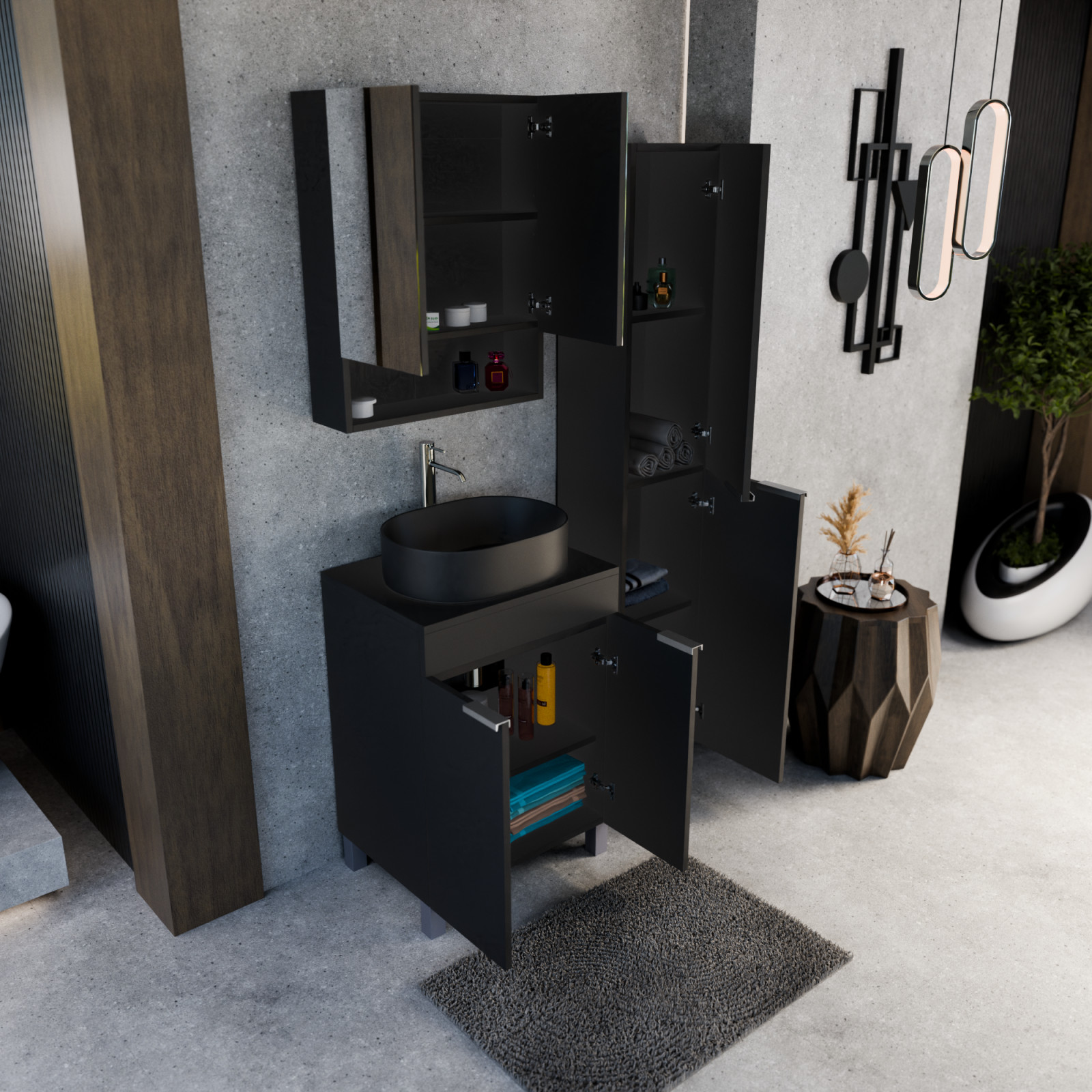 Saját márkás 60 cm széles komplett fürdőszoba bútor álló mosdószekrénnyel matt fekete színben, szálcsiszolt króm fogantyúkkal és lábakkal, matt fekete színű mosdópulttal, tükrös szekrénnyel és magasszekrénnyel.