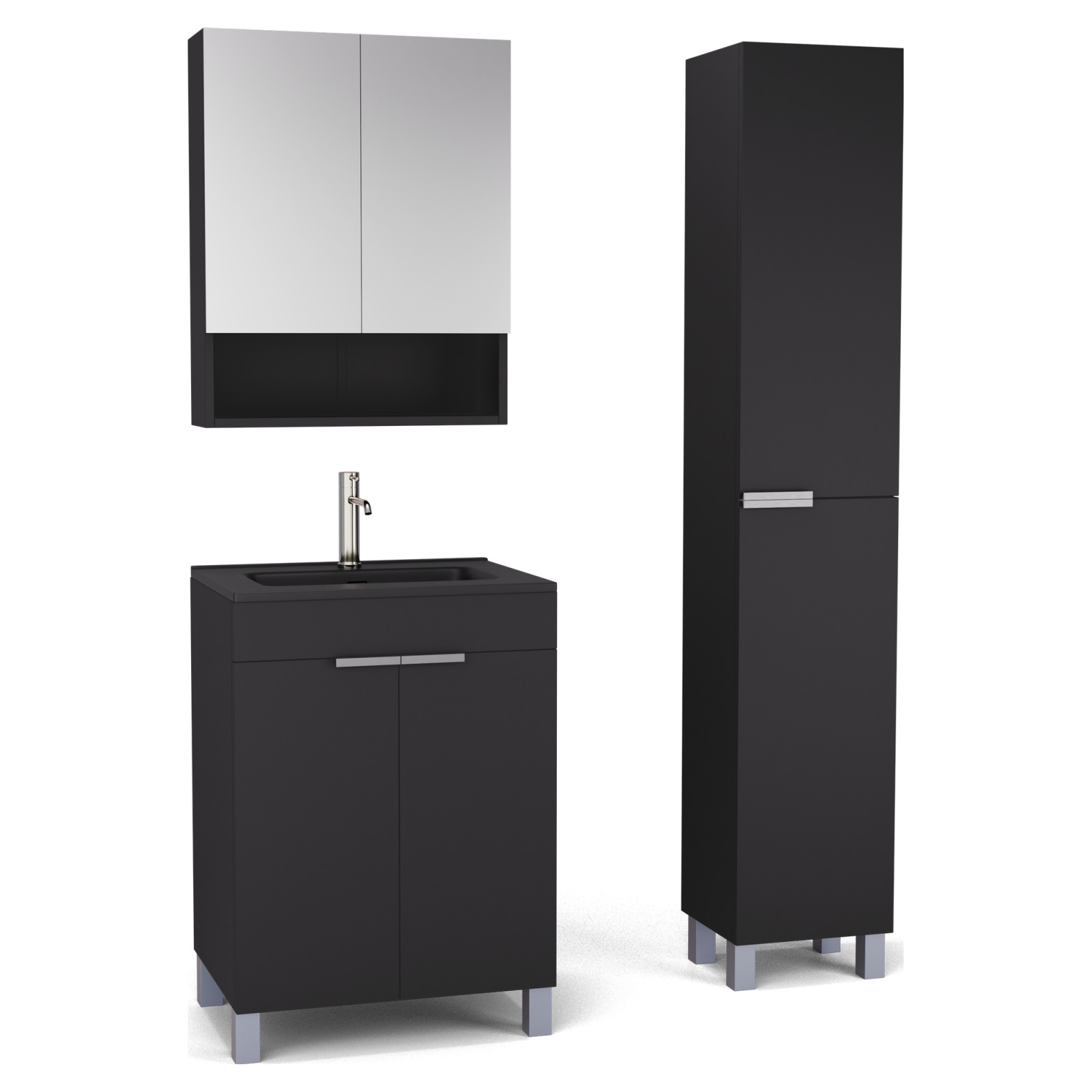Paris Matt Black 60 komplett fürdőszoba bútor szett, szálcsiszolt króm fogantyúkkal és lábakkal