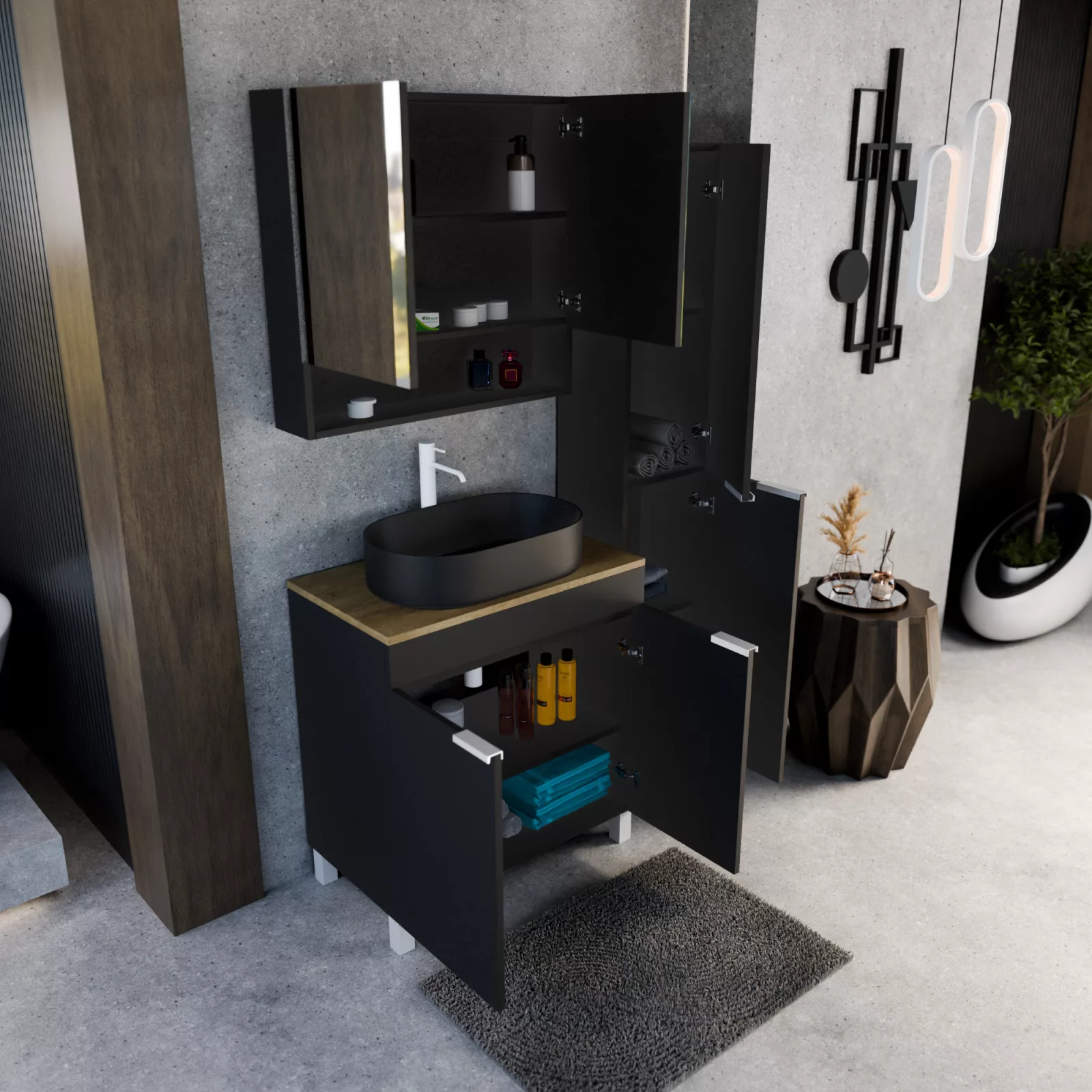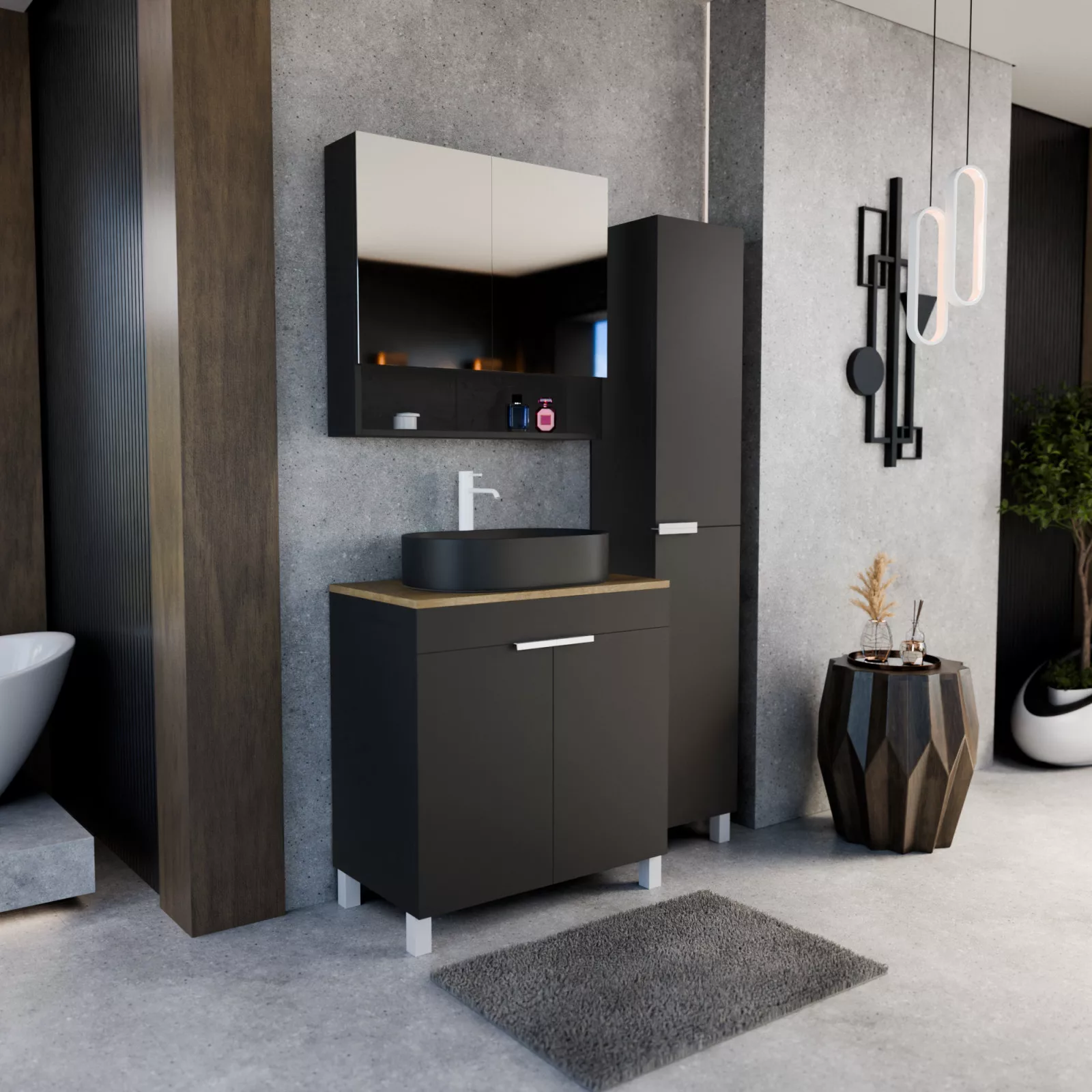 Napjainkban a praktikum mellett a fürdőszoba esztétikus megjelenése is fontos szempont. A lábon álló bútorok egyre elterjedtebbé válnak, mivel számos előnnyel rendelkeznek, ide sorolható a modern, könnyed megjelenés és az egyszerű tisztítás. A lábon álló fürdőszobai bútorok a klasszikus és modernebb stílusú fürdőszobákban is megállják a helyüket egyaránt. Nagyfokú rugalmasság jellemzi őket, mivel szinte bárhol elhelyezhetők a fürdőszobán belül. További előnyük, hogy soft close (csillapítós) zsanérral felszereltek, így  becsukáskor az ajtó vagy fiók finoman záródik be, csökkentve a terhelést és növelve az élettartamot. A szekrény fehér és matt fekete mosdóval, illetve mosdópulttal is szabadon kombinálható ízlés szerint. A teljesség érdekében a mosdószekrényekhez illő tükrös szekrényt és magas szekrényt is választhatunk, hogy a fürdőszobában lévő bútorok egy szemet gyönyörködtető egységet alkossanak.