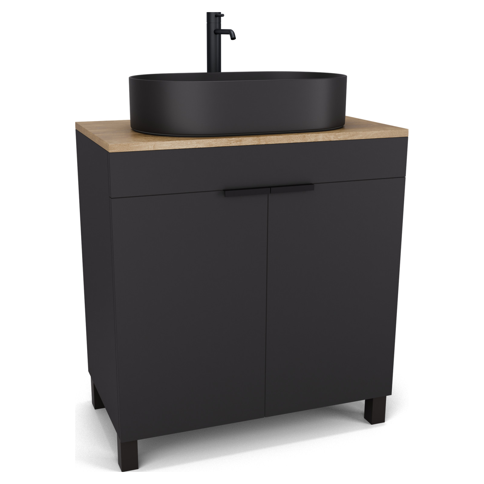 Saját márkás 80 cm széles álló mosdószekrény matt fekete színben, matt fekete fogantyúkkal és lábakkal, tölgyfa színű mosdópulttal, soft-close zsanérokkal ellátva.