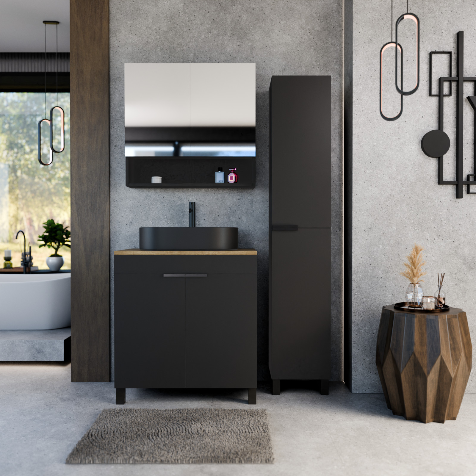 HD Paris Matt Black 80 álló mosdószekrény tölgyfa színű mosdópulttal és matt fekete elemekkel
