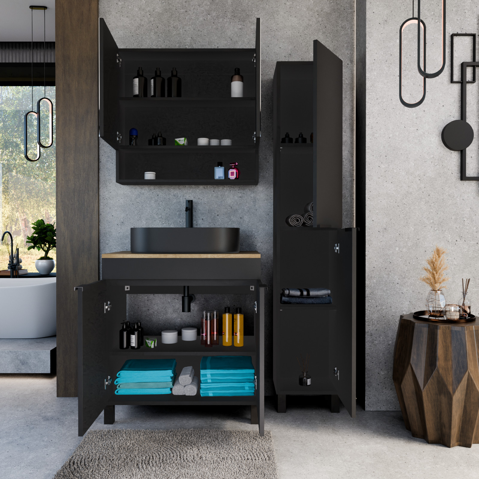 • matt fekete mosdószekrény, kivehető polccal