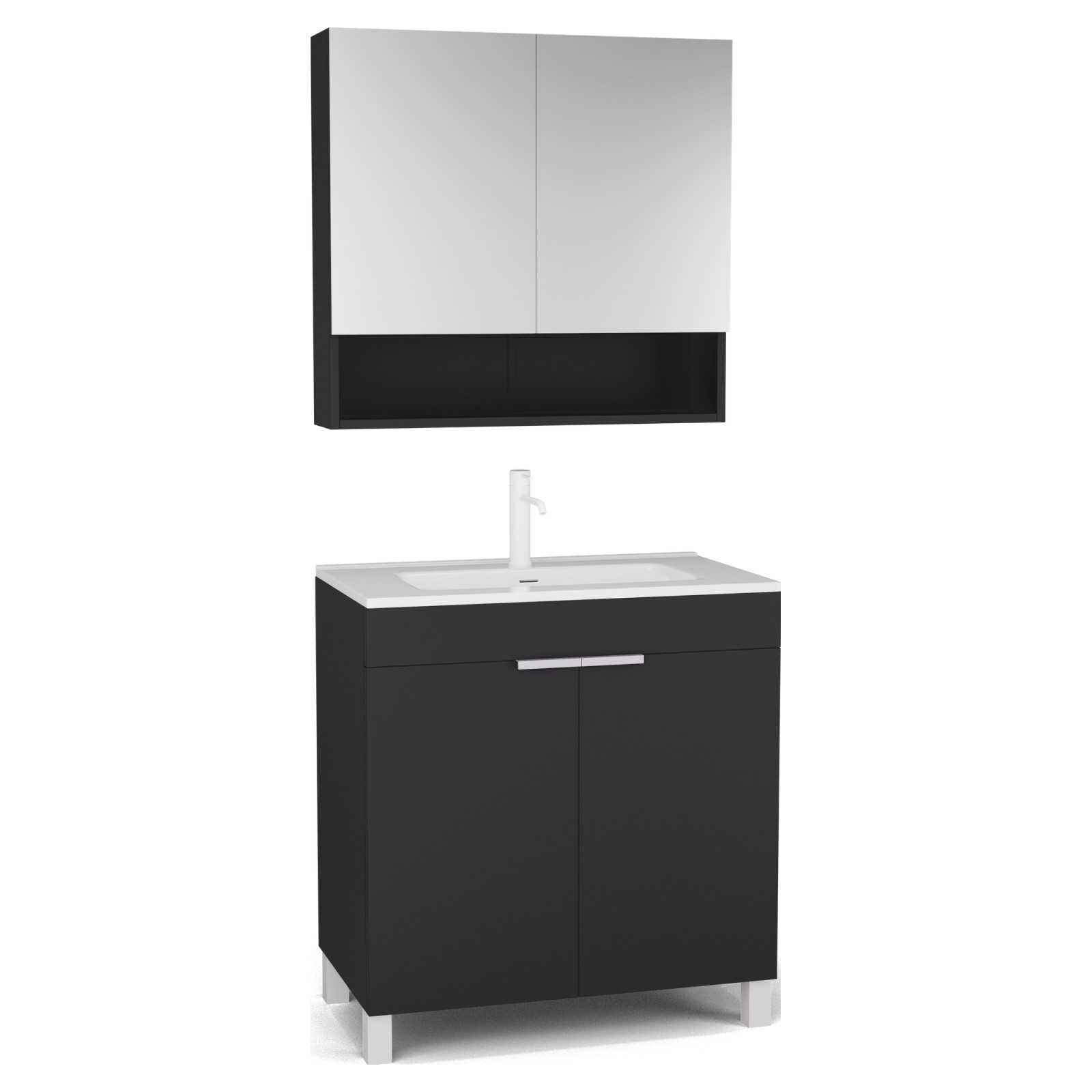 Saját márkás 80 cm széles komplett fürdőszoba bútor álló mosdószekrénnyel matt fekete színben, matt fehér fogantyúkkal és lábakkal és fali tükrös szekrénnyel.