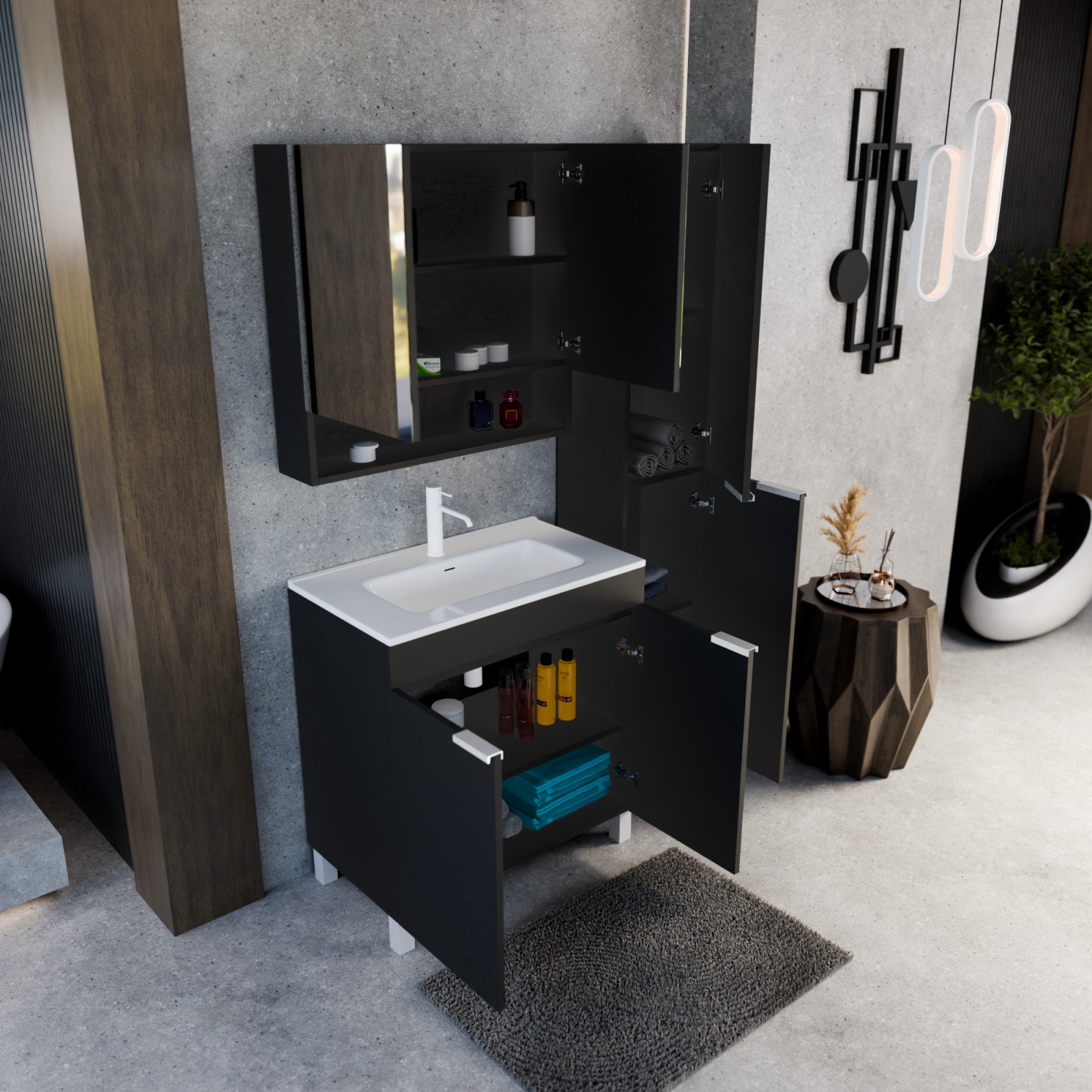 • matt fekete mosdószekrény, kivehető polccal