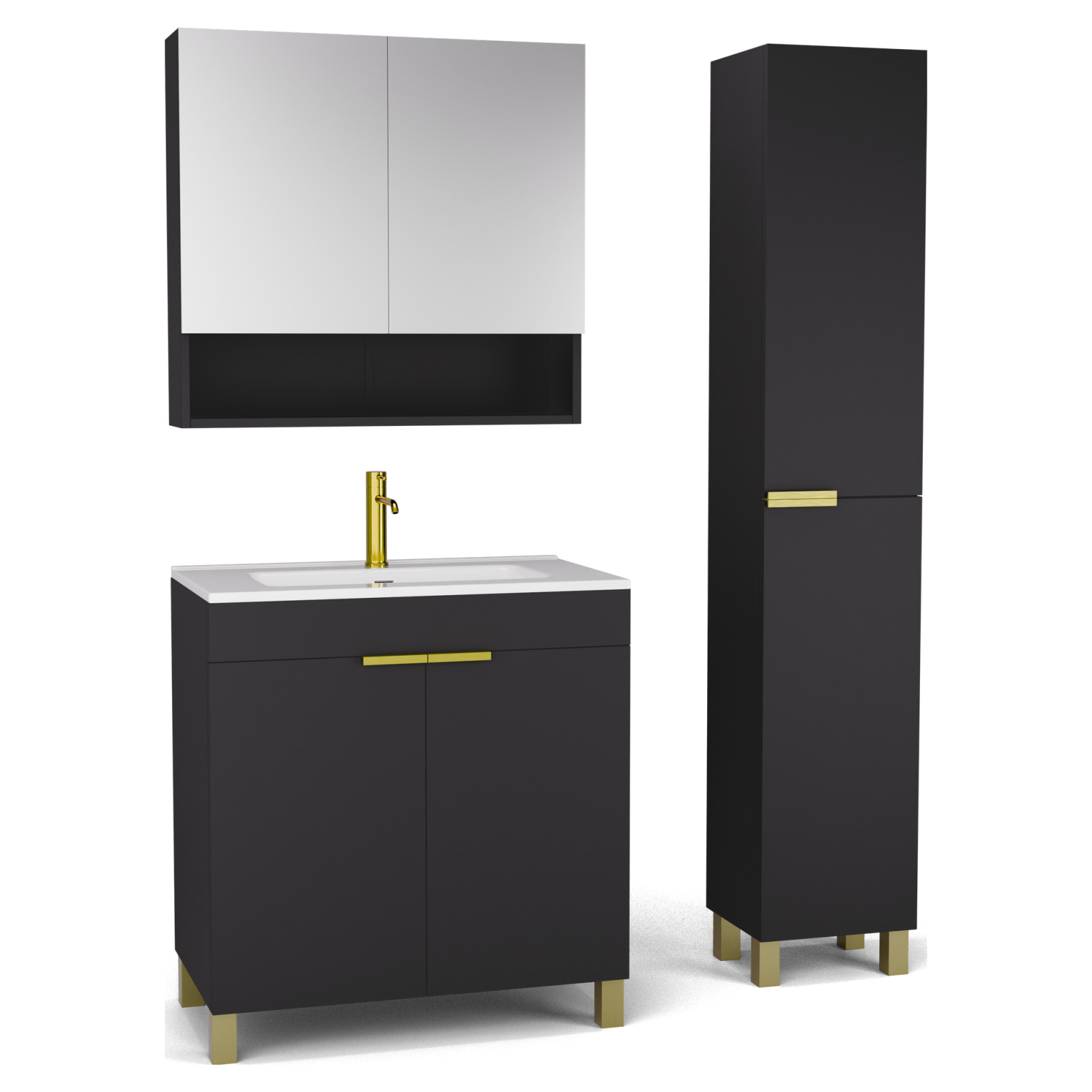 HD Paris Matt Black 80 komplett fürdőszoba bútor szett álló mosdószekrénnyel, szálcsiszolt arany elemekkel, tükrös szekrénnyel és magasszekrénnyel