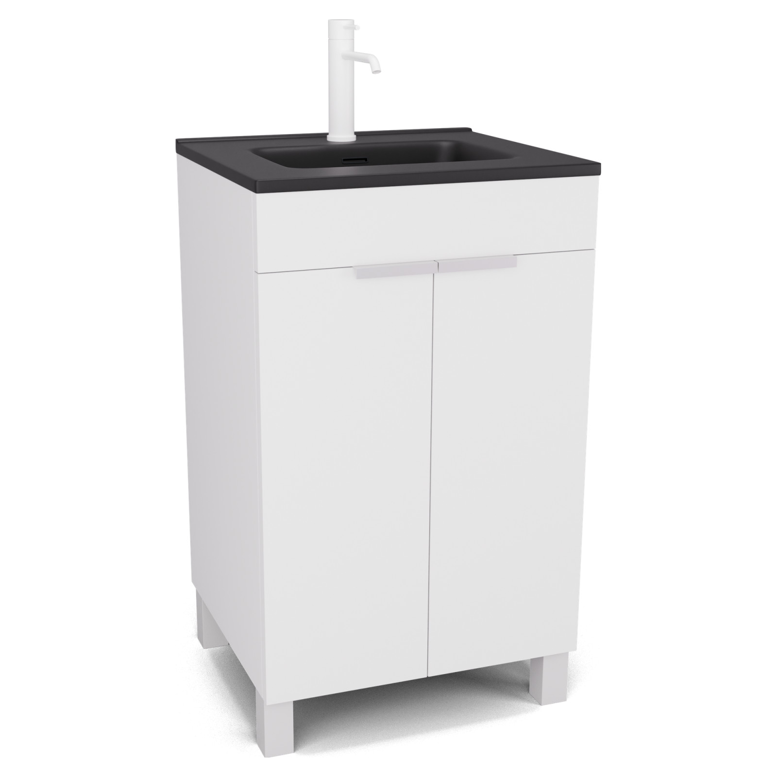 Saját márkás 60 cm széles álló mosdószekrény matt fehér színben, matt fehér fogantyúkkal és lábakkal, fekete slim mosdóval, soft-close zsanérokkal ellátva.