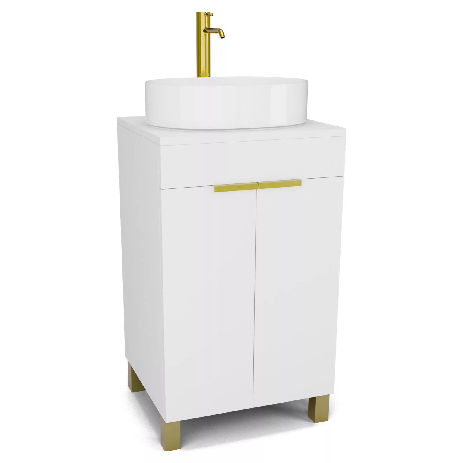 Saját márkás 60 cm széles álló mosdószekrény matt fehér színben, szálcsiszolt arany fogantyúkkal és lábakkal, matt fehér színű mosdópulttal, soft-close zsanérokkal ellátva.