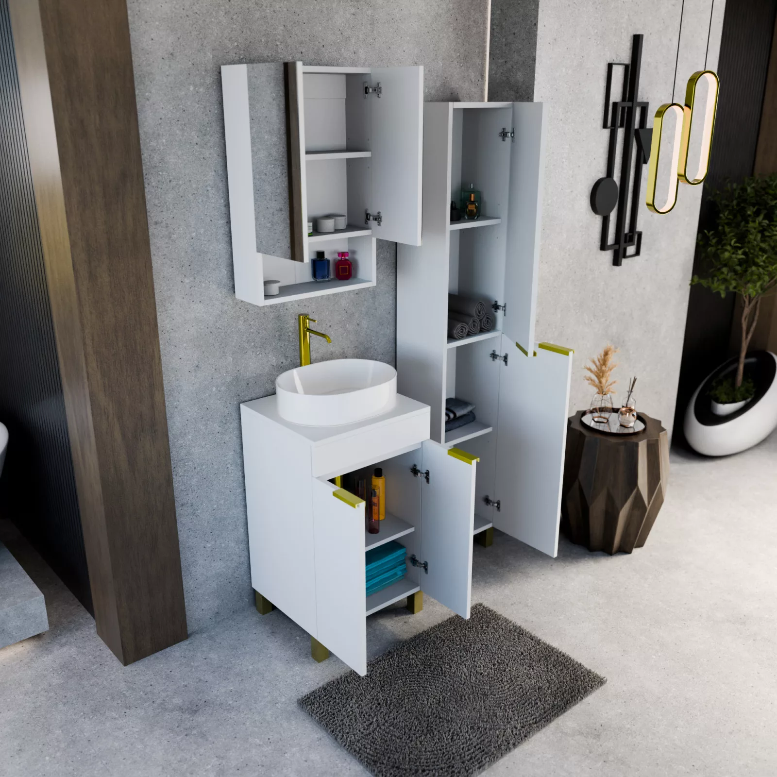 Napjainkban a praktikum mellett a fürdőszoba esztétikus megjelenése is fontos szempont. A lábon álló bútorok egyre elterjedtebbé válnak, mivel számos előnnyel rendelkeznek, ide sorolható a modern, könnyed megjelenés és az egyszerű tisztítás. A lábon álló fürdőszobai bútorok a klasszikus és modernebb stílusú fürdőszobákban is megállják a helyüket egyaránt. Nagyfokú rugalmasság jellemzi őket, mivel szinte bárhol elhelyezhetők a fürdőszobán belül. További előnyük, hogy soft close (csillapítós) zsanérral felszereltek, így  becsukáskor az ajtó vagy fiók finoman záródik be, csökkentve a terhelést és növelve az élettartamot. A szekrény fehér és matt fekete mosdóval, illetve mosdópulttal is szabadon kombinálható ízlés szerint. A teljesség érdekében a mosdószekrényekhez illő tükrös szekrényt és magas szekrényt is választhatunk, hogy a fürdőszobában lévő bútorok egy szemet gyönyörködtető egységet alkossanak.