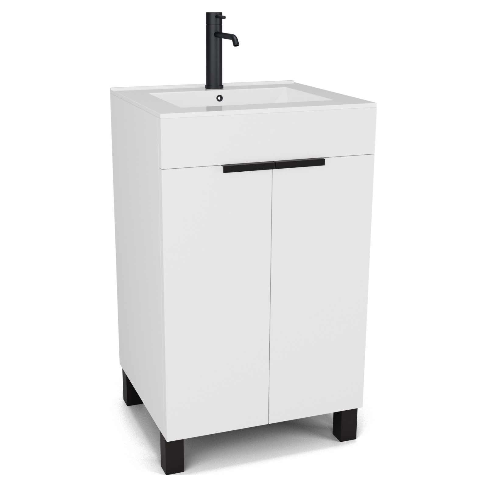 Saját márkás 50 cm széles álló mosdószekrény matt fehér színben, matt fekete fogantyúkkal és lábakkal, soft-close zsanérokkal ellátva.