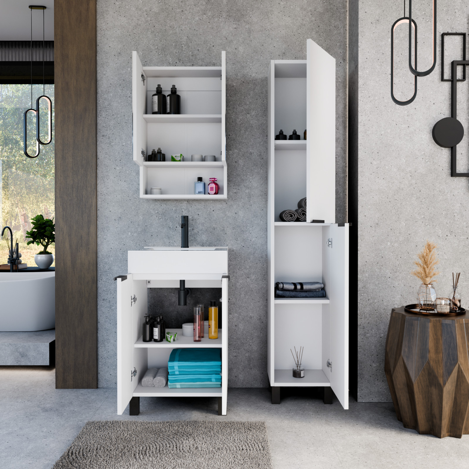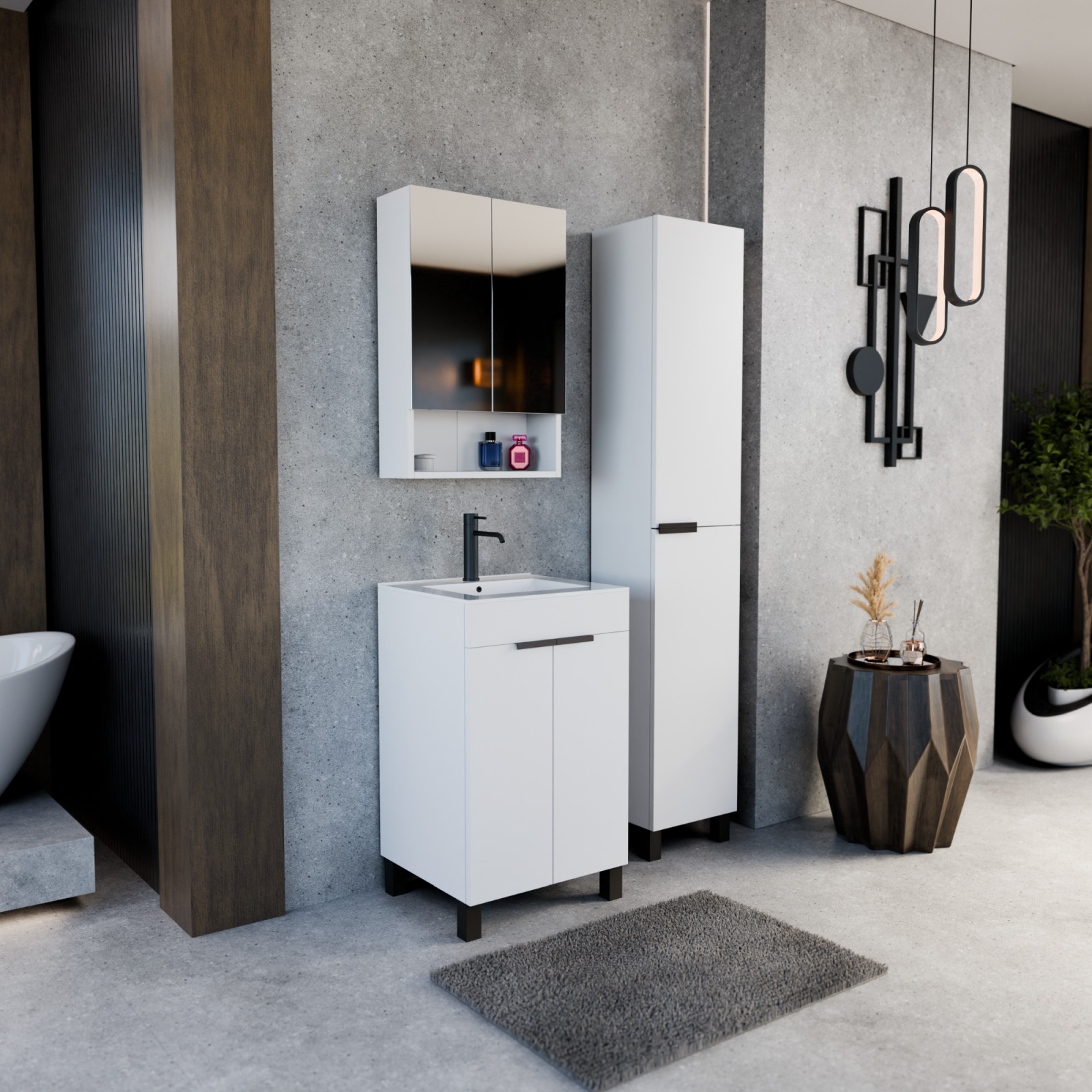 Napjainkban a praktikum mellett a fürdőszoba esztétikus megjelenése is fontos szempont. A lábon álló bútorok egyre elterjedtebbé válnak, mivel számos előnnyel rendelkeznek, ide sorolható a modern, könnyed megjelenés és az egyszerű tisztítás. A lábon álló fürdőszobai bútorok a klasszikus és modernebb stílusú fürdőszobákban is megállják a helyüket egyaránt. Nagyfokú rugalmasság jellemzi őket, mivel szinte bárhol elhelyezhetők a fürdőszobán belül. További előnyük, hogy soft close (csillapítós) zsanérral felszereltek, így  becsukáskor az ajtó vagy fiók finoman záródik be, csökkentve a terhelést és növelve az élettartamot. A szekrény fehér és matt fekete mosdóval, illetve mosdópulttal is szabadon kombinálható ízlés szerint. A teljesség érdekében a mosdószekrényekhez illő tükrös szekrényt és magas szekrényt is választhatunk, hogy a fürdőszobában lévő bútorok egy szemet gyönyörködtető egységet alkossanak.