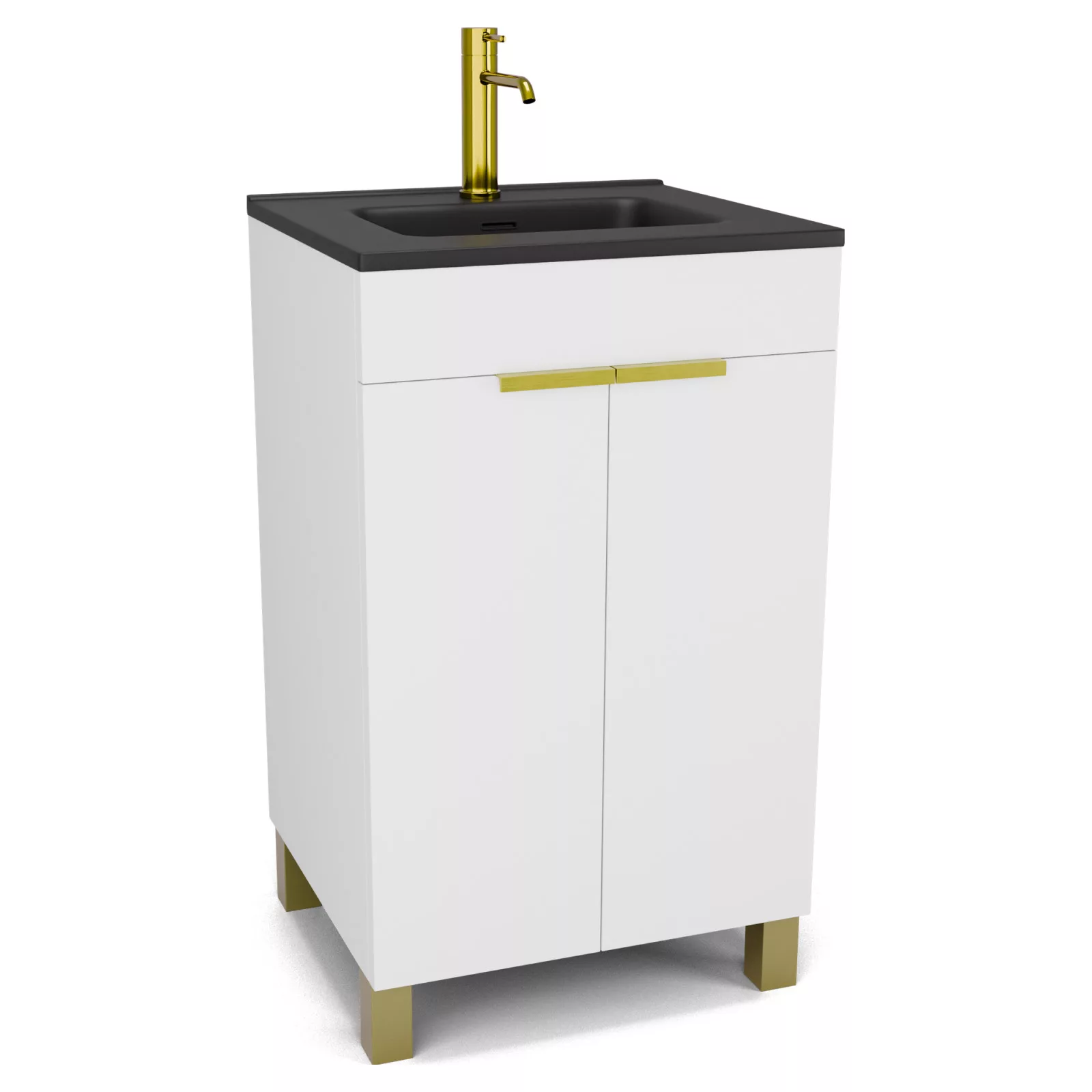 Saját márkás 60 cm széles álló mosdószekrény matt fehér színben, szálcsiszolt arany fogantyúkkal és lábakkal, fekete slim mosdóval, soft-close zsanérokkal ellátva.