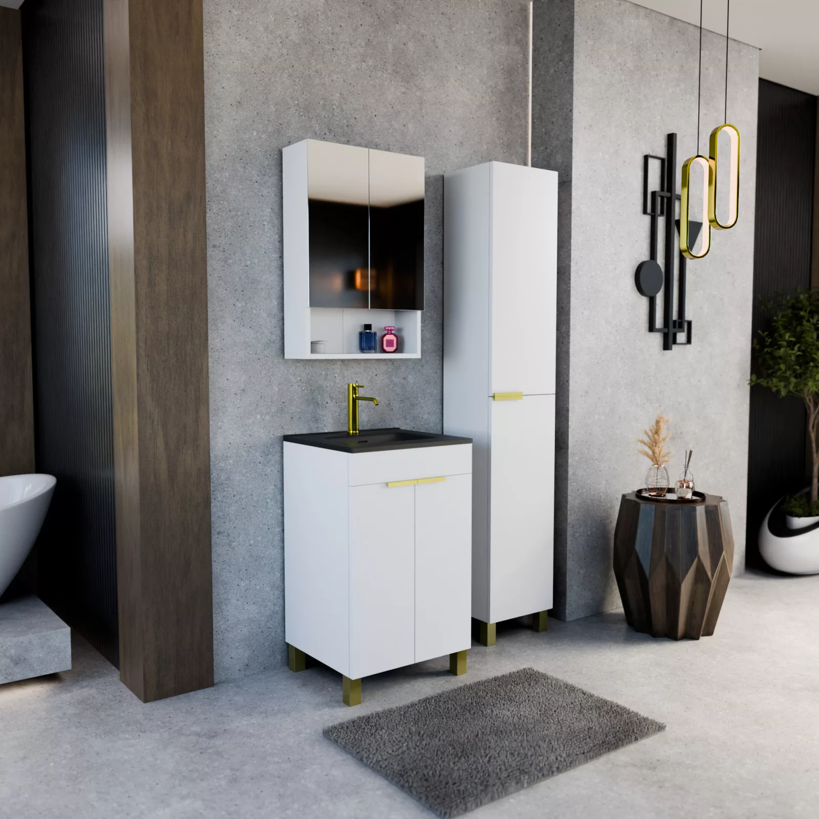 HD Paris Matt White 50 álló mosdószekrény szálcsiszolt arany elemekkel és matt fekete slim mosdóval