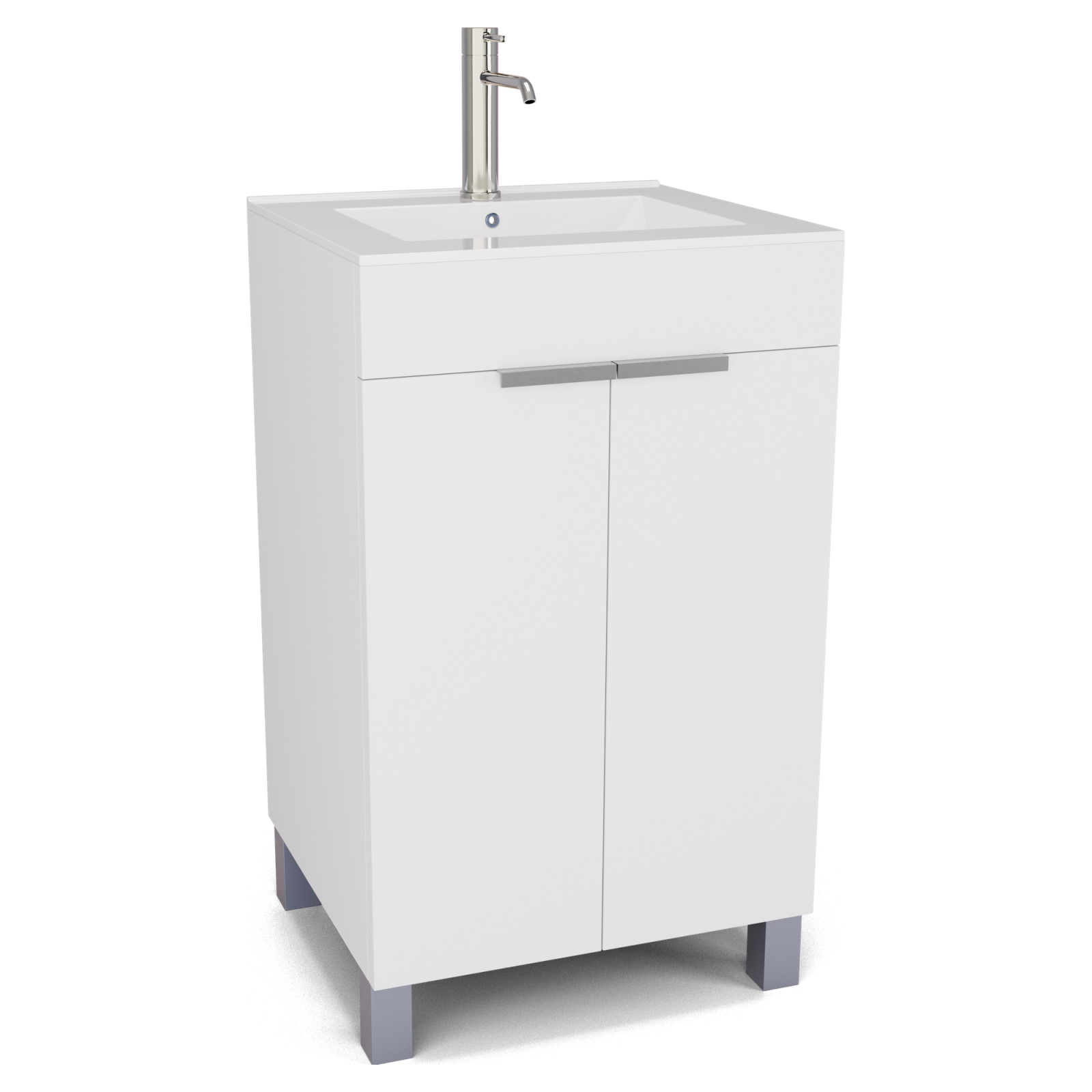 Saját márkás 50 cm széles álló mosdószekrény matt fehér színben, szálcsiszolt króm fogantyúkkal és lábakkal, fényes fehér slim mosdóval, soft-close zsanérokkal ellátva.
