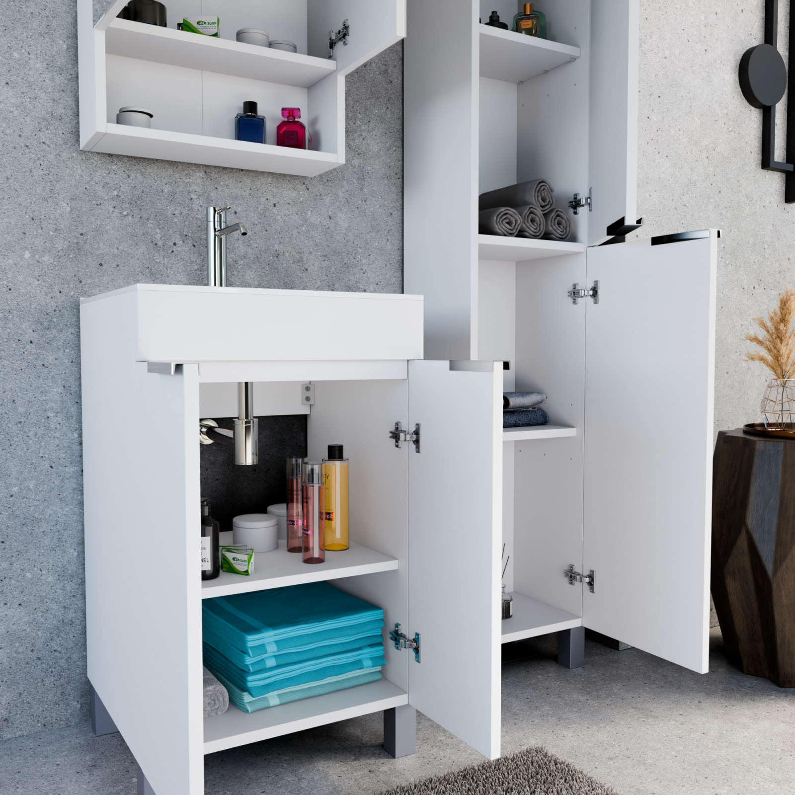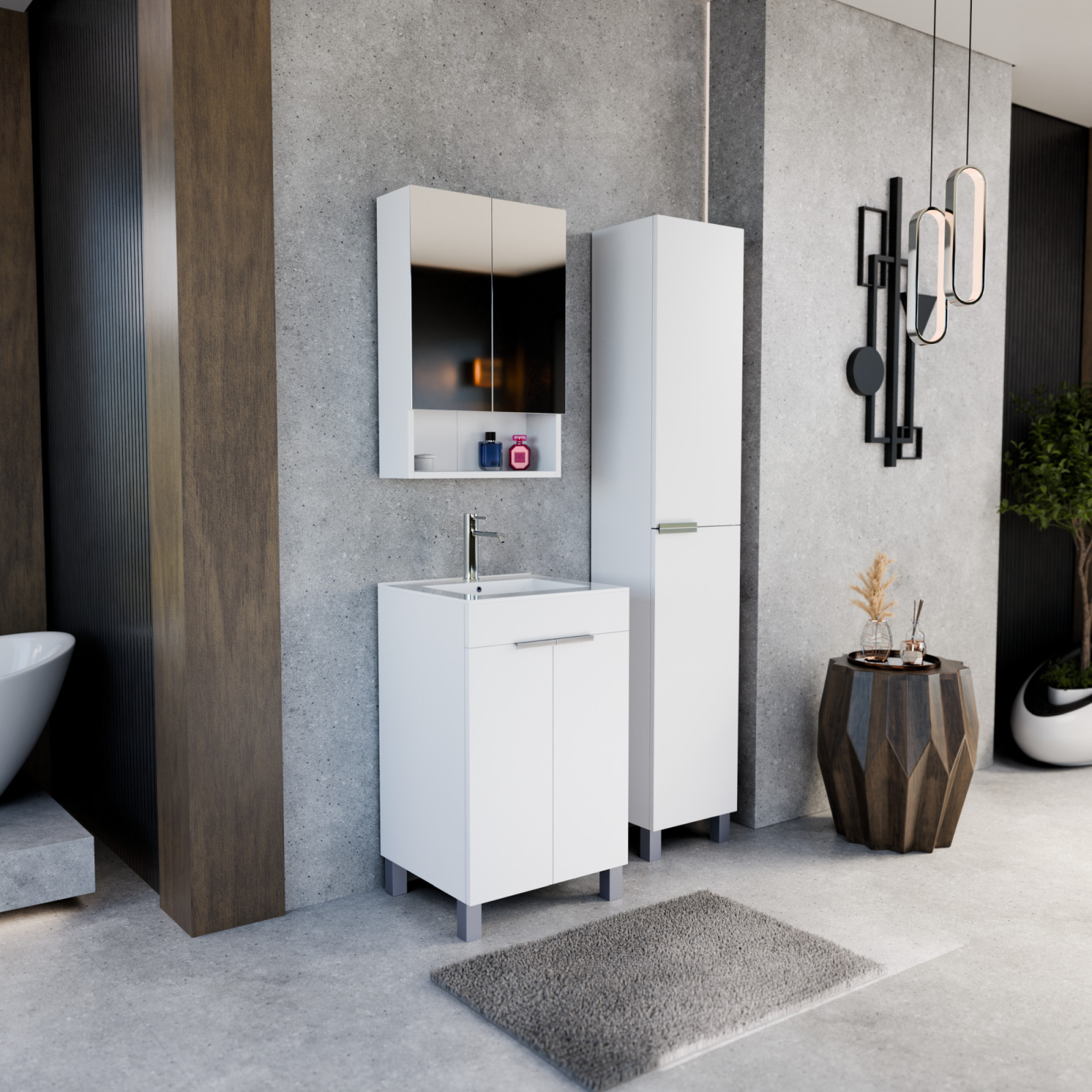 Napjainkban a praktikum mellett a fürdőszoba esztétikus megjelenése is fontos szempont. A lábon álló bútorok egyre elterjedtebbé válnak, mivel számos előnnyel rendelkeznek, ide sorolható a modern, könnyed megjelenés és az egyszerű tisztítás. A lábon álló fürdőszobai bútorok a klasszikus és modernebb stílusú fürdőszobákban is megállják a helyüket egyaránt. Nagyfokú rugalmasság jellemzi őket, mivel szinte bárhol elhelyezhetők a fürdőszobán belül. További előnyük, hogy soft close (csillapítós) zsanérral felszereltek, így  becsukáskor az ajtó vagy fiók finoman záródik be, csökkentve a terhelést és növelve az élettartamot. A szekrény fehér és matt fekete mosdóval, illetve mosdópulttal is szabadon kombinálható ízlés szerint. A teljesség érdekében a mosdószekrényekhez illő tükrös szekrényt és magas szekrényt is választhatunk, hogy a fürdőszobában lévő bútorok egy szemet gyönyörködtető egységet alkossanak.