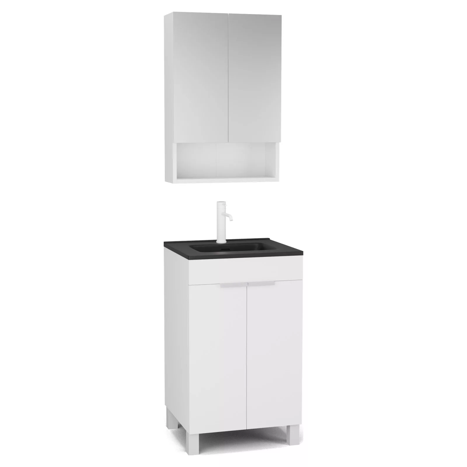 HD Paris Matt White 50 komplett fürdőszoba bútor álló mosdószekrénnyel, matt fehér elemekkel, matt fekete slim mosdóval és tükrös szekrénnyel