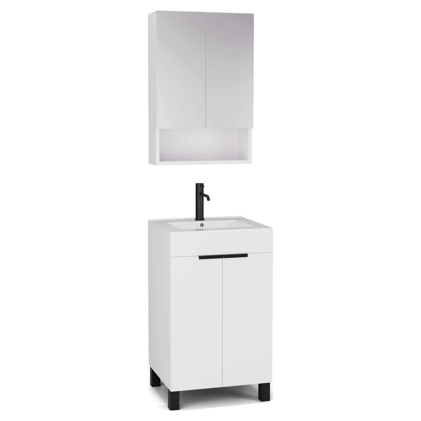 Saját márkás 50 cm széles komplett fürdőszoba bútor álló mosdószekrénnyel matt fehér színben, matt fekete fogantyúkkal és lábakkal, fényes fehér slim mosdóval és fali tükrös szekrénnyel.