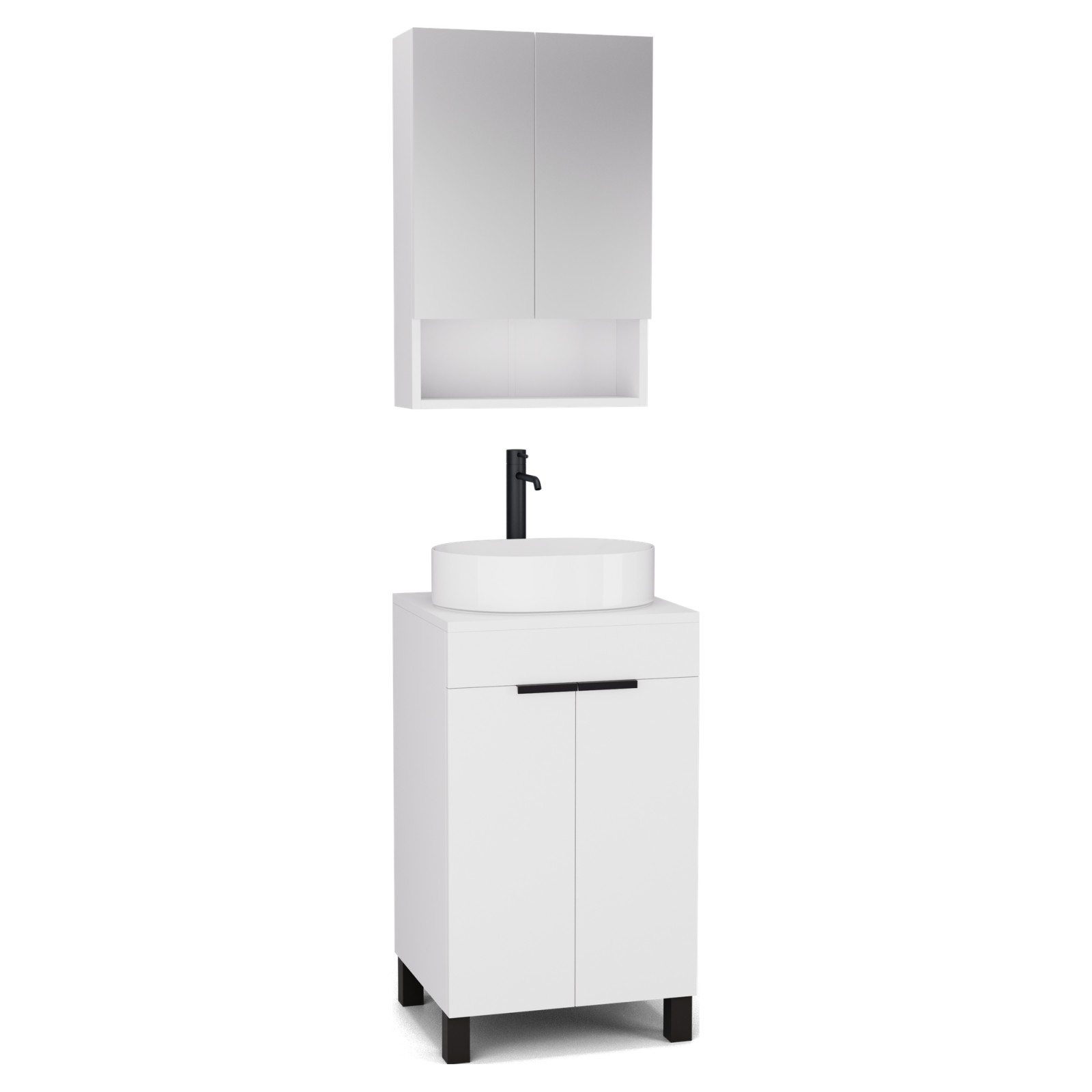 Saját márkás 50 cm széles komplett fürdőszoba bútor álló mosdószekrénnyel matt fehér színben, matt fekete fogantyúkkal és lábakkal, matt fehér színű mosdópulttal és fali tükrös szekrénnyel.