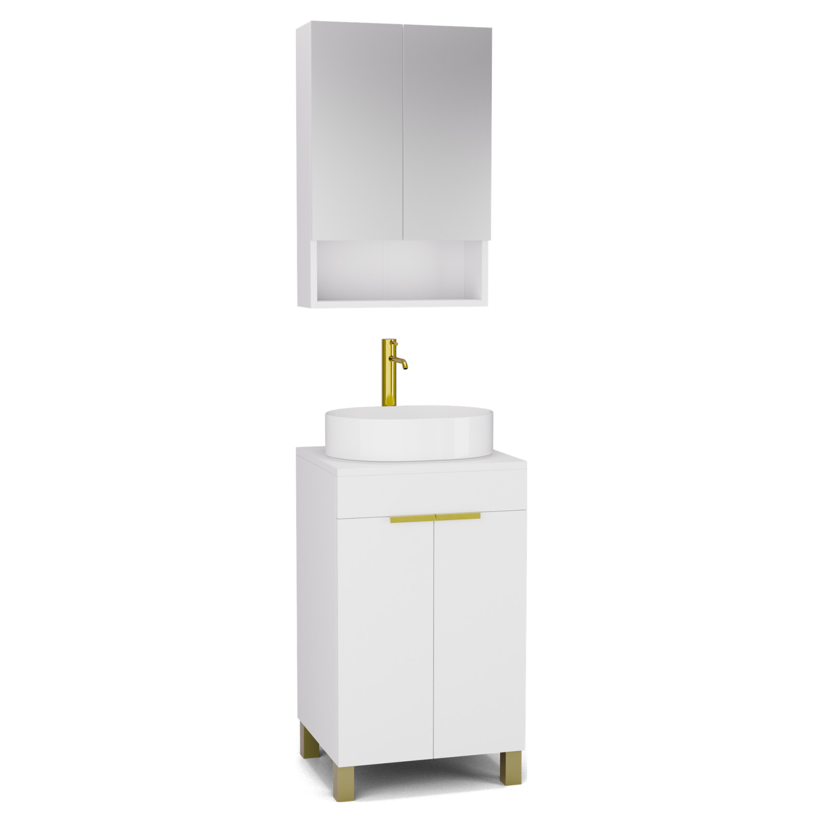 Saját márkás 60 cm széles komplett fürdőszoba bútor álló mosdószekrénnyel matt fehér színben, szálcsiszolt arany fogantyúkkal és lábakkal, matt fehér színű mosdópulttal és fali tükrös szekrénnyel.