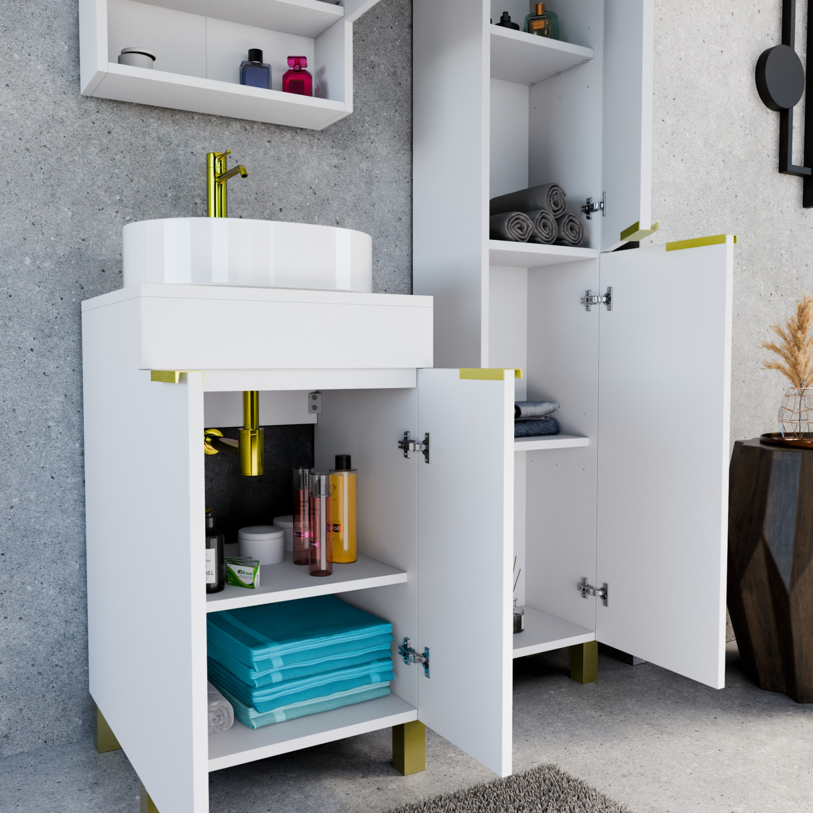 Paris Matt White 50 komplett fürdőszoba bútor, szálcsiszolt arany fogantyúkkal és lábakkal