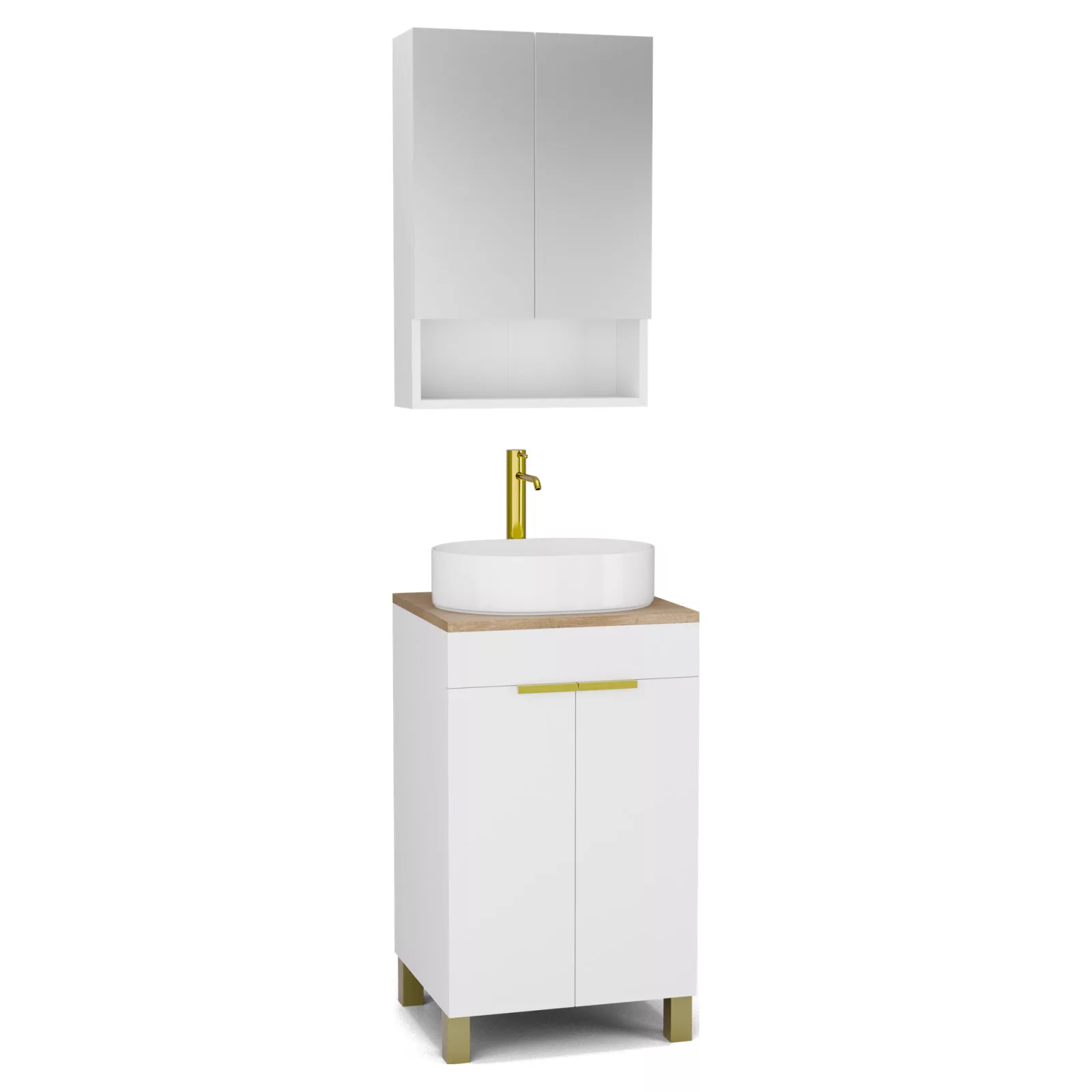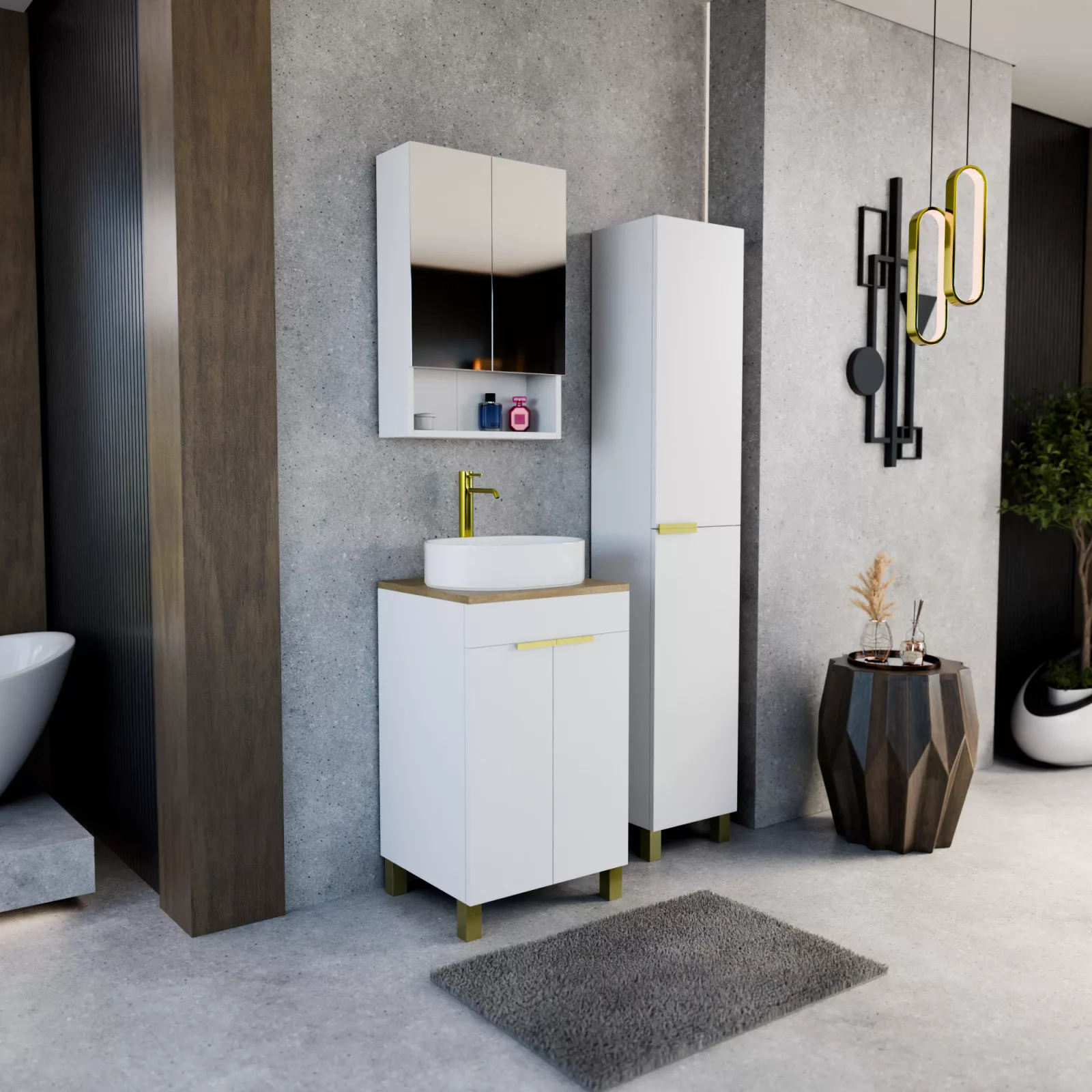 Saját márkás 60 cm széles komplett fürdőszoba bútor álló mosdószekrénnyel matt fehér színben, szálcsiszolt arany fogantyúkkal és lábakkal, tölgyfa színű mosdópulttal és fali tükrös szekrénnyel.
