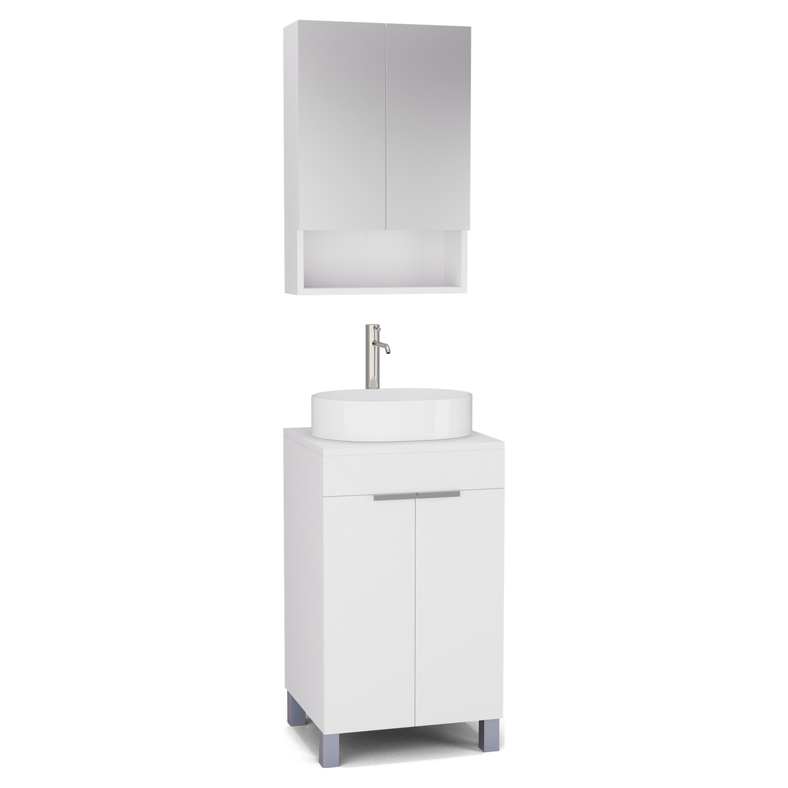 Saját márkás 50 cm széles komplett fürdőszoba bútor álló mosdószekrénnyel matt fehér színben, szálcsiszolt króm fogantyúkkal és lábakkal, matt fehér színű mosdópulttal és fali tükrös szekrénnyel.
