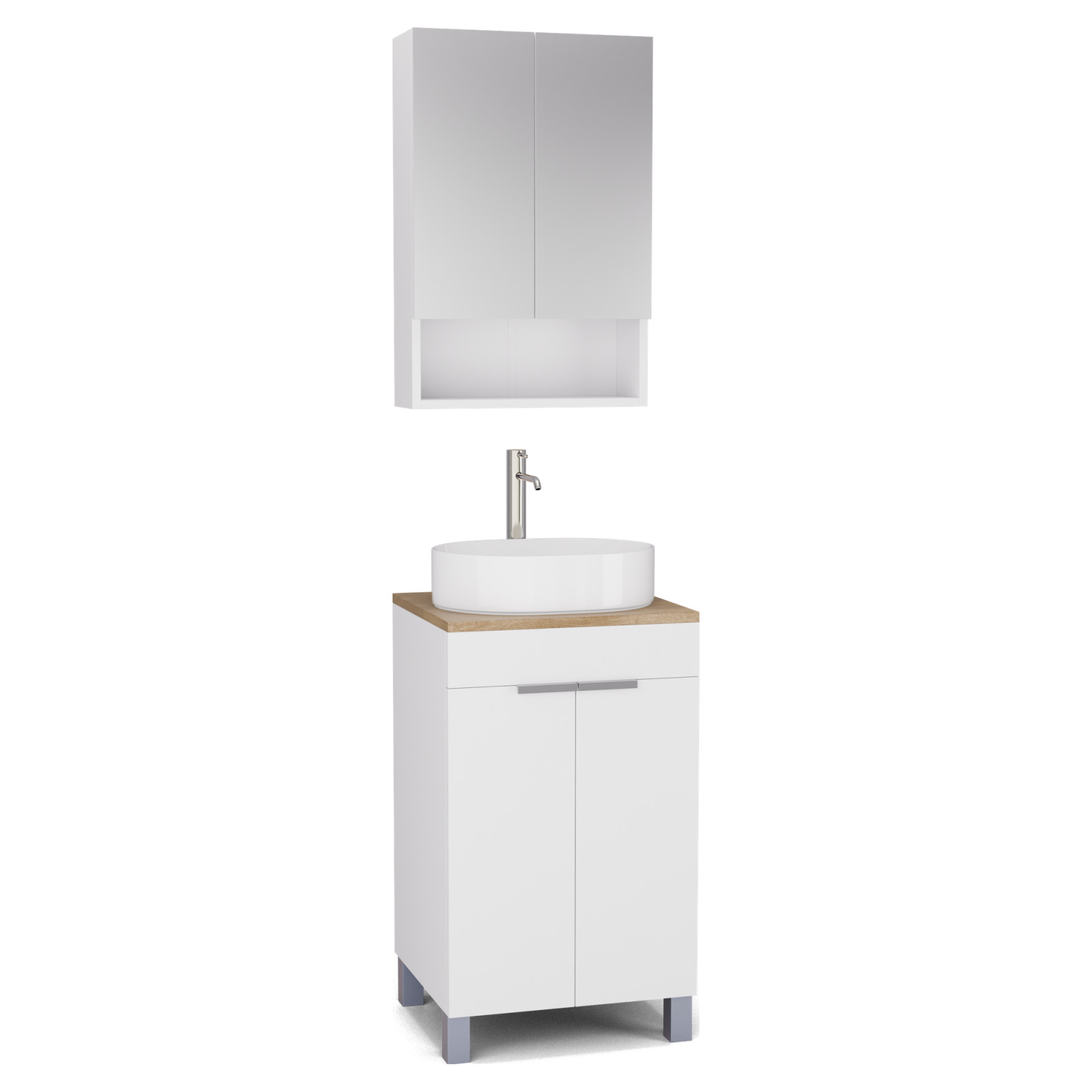 Saját márkás 50 cm széles komplett fürdőszoba bútor álló mosdószekrénnyel matt fehér színben, szálcsiszolt króm fogantyúkkal és lábakkal, tölgyfa színű mosdópulttal és fali tükrös szekrénnyel.