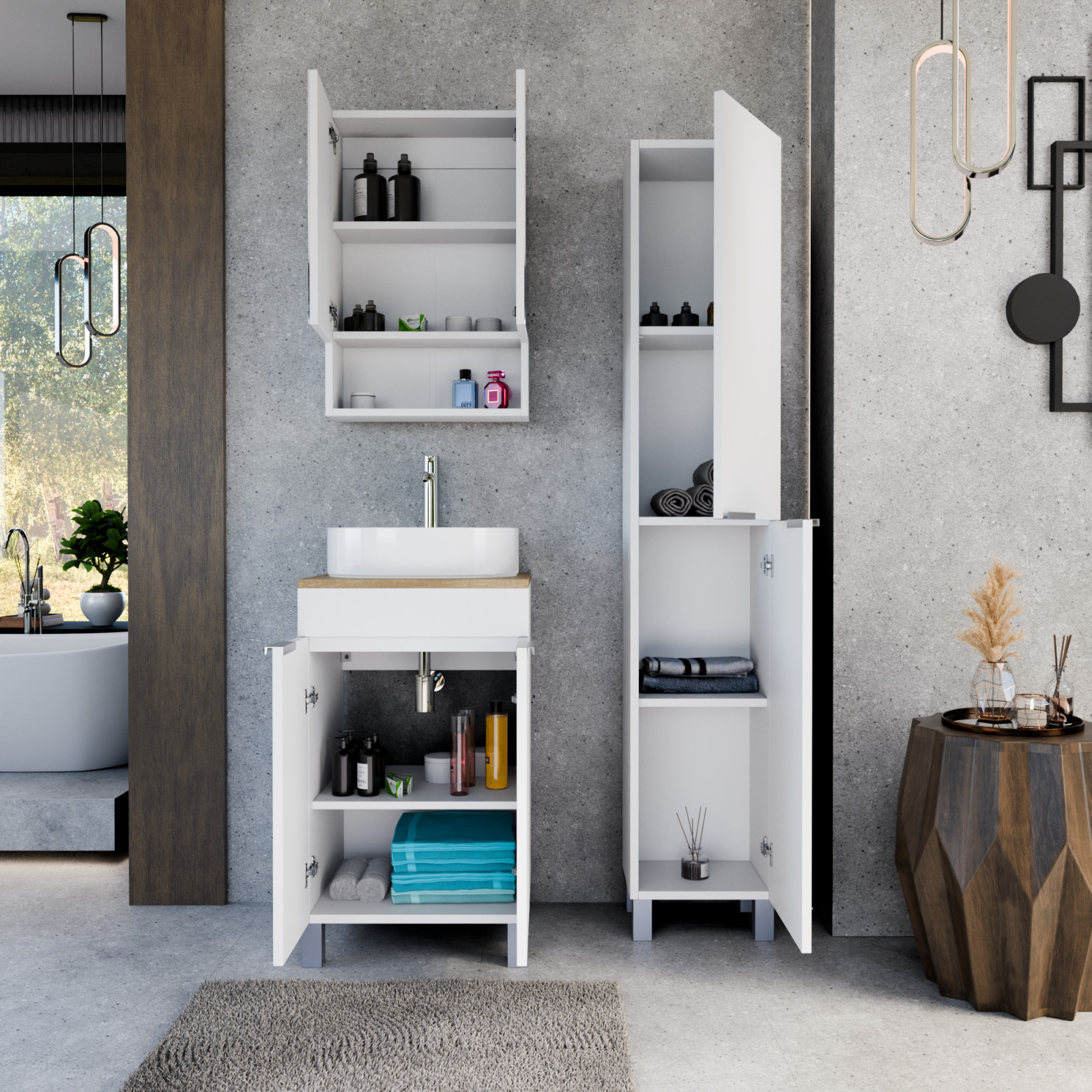 Napjainkban a praktikum mellett a fürdőszoba esztétikus megjelenése is fontos szempont. A lábon álló bútorok egyre elterjedtebbé válnak, mivel számos előnnyel rendelkeznek, ide sorolható a modern, könnyed megjelenés és az egyszerű tisztítás. A lábon álló fürdőszobai bútorok a klasszikus és modernebb stílusú fürdőszobákban is megállják a helyüket egyaránt. Nagyfokú rugalmasság jellemzi őket, mivel szinte bárhol elhelyezhetők a fürdőszobán belül. További előnyük, hogy soft close (csillapítós) zsanérral felszereltek, így  becsukáskor az ajtó vagy fiók finoman záródik be, csökkentve a terhelést és növelve az élettartamot. A szekrény fehér és matt fekete mosdóval, illetve mosdópulttal is szabadon kombinálható ízlés szerint. A teljesség érdekében a mosdószekrényekhez illő tükrös szekrényt és magas szekrényt is választhatunk, hogy a fürdőszobában lévő bútorok egy szemet gyönyörködtető egységet alkossanak.