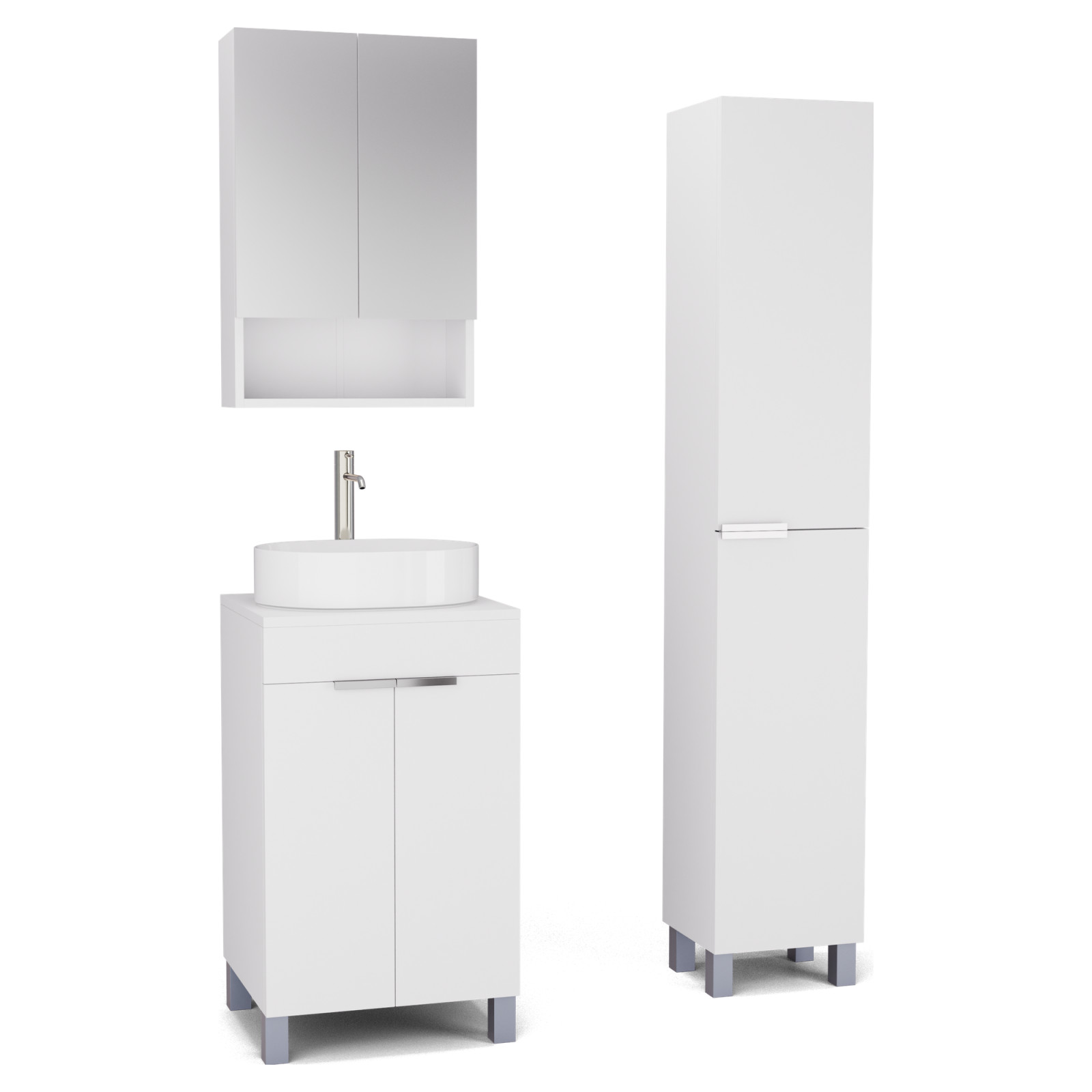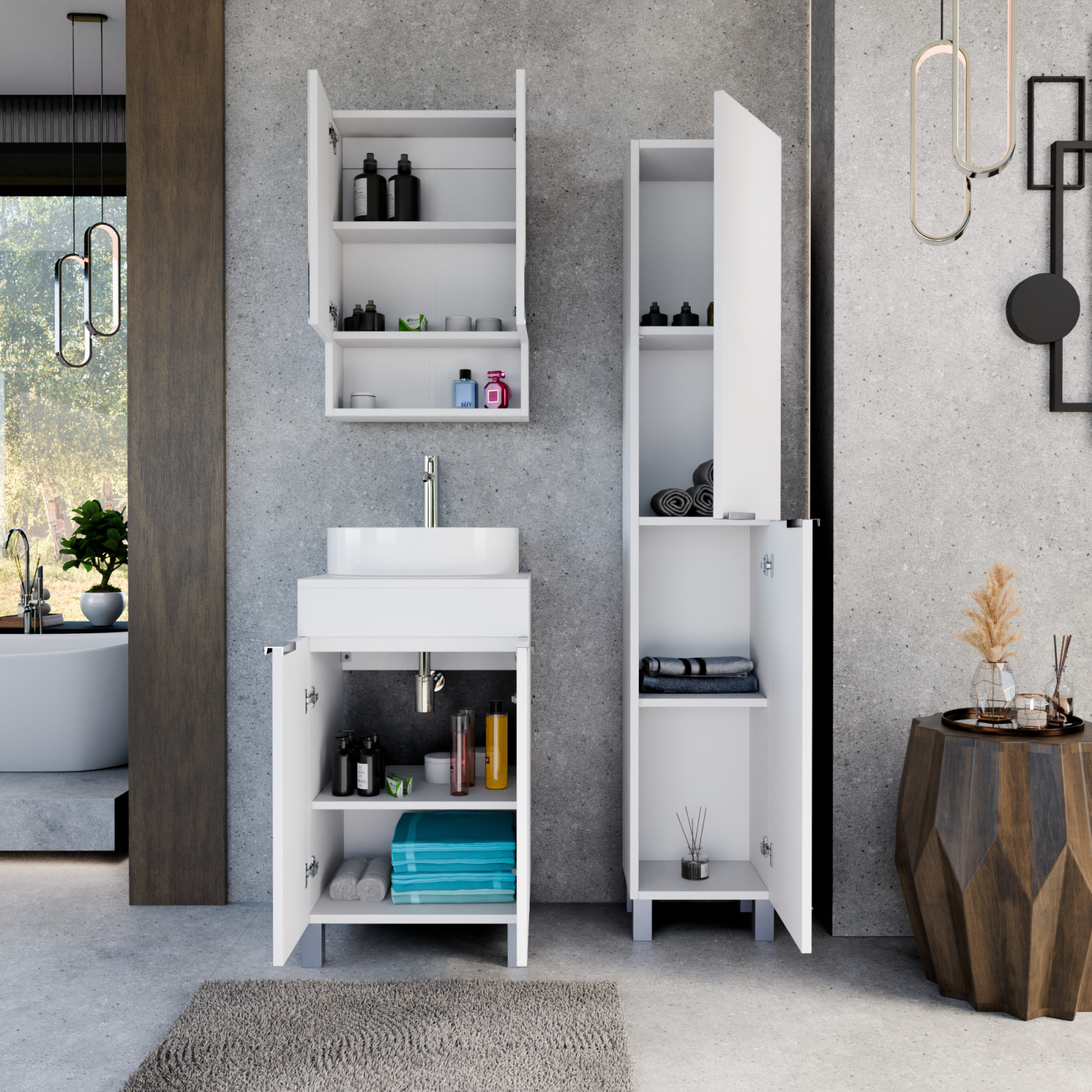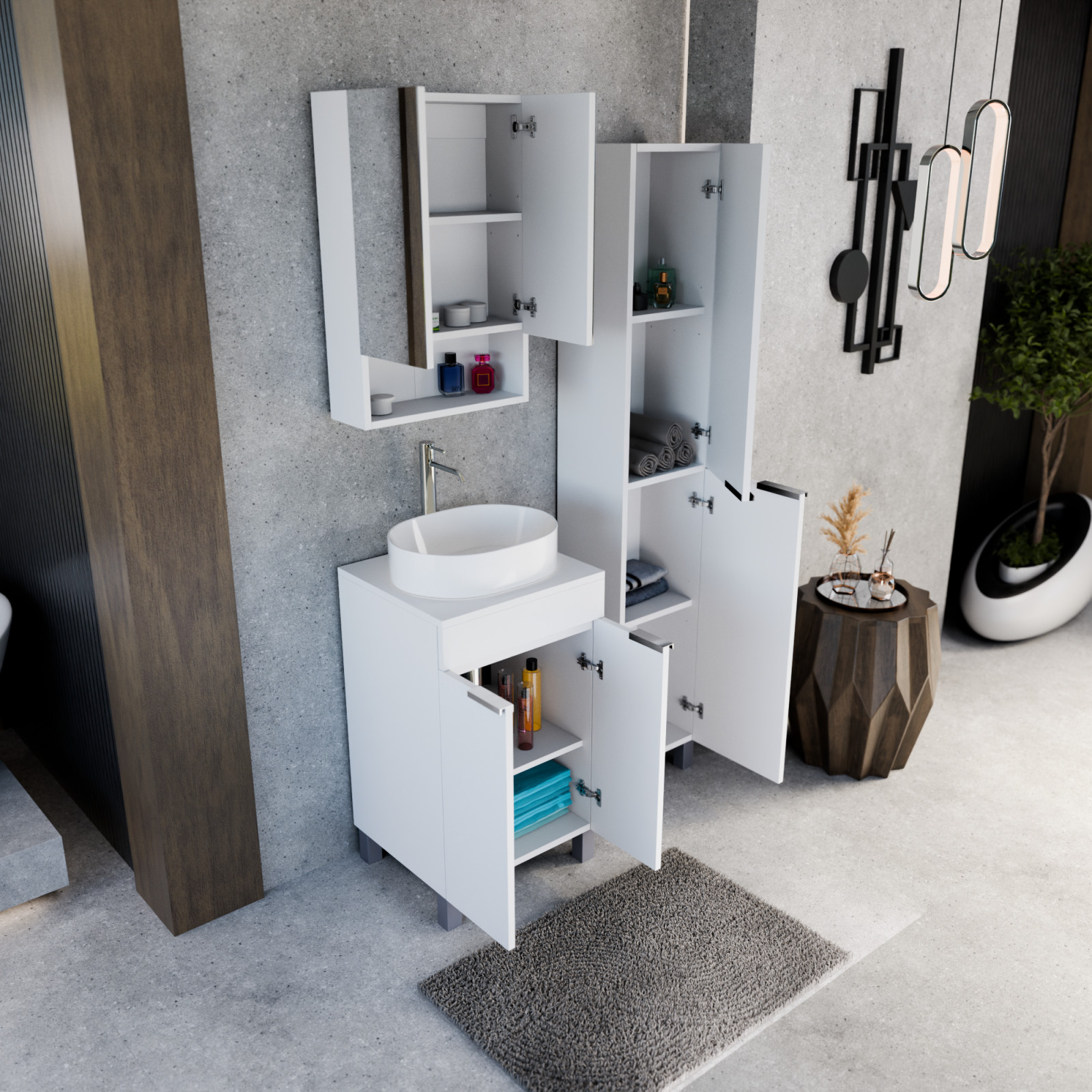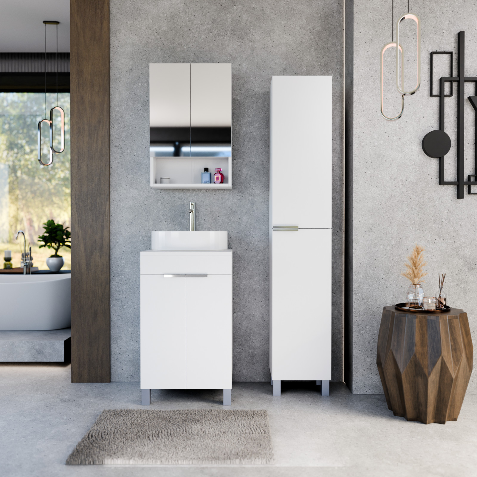 Saját márkás 50 cm széles komplett fürdőszoba bútor álló mosdószekrénnyel matt fehér színben, fényes króm fogantyúkkal és lábakkal, matt fehér színű mosdópulttal, tükrös szekrénnyel és magasszekrénnyel.