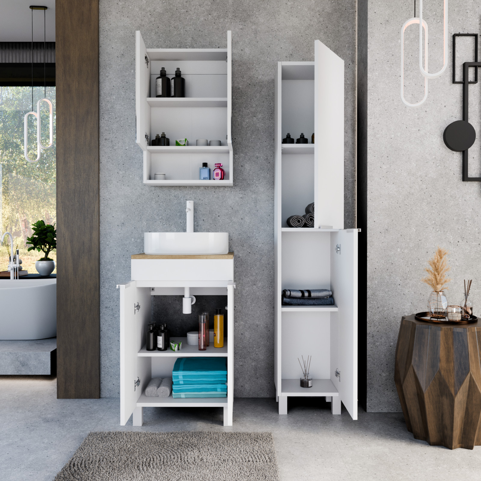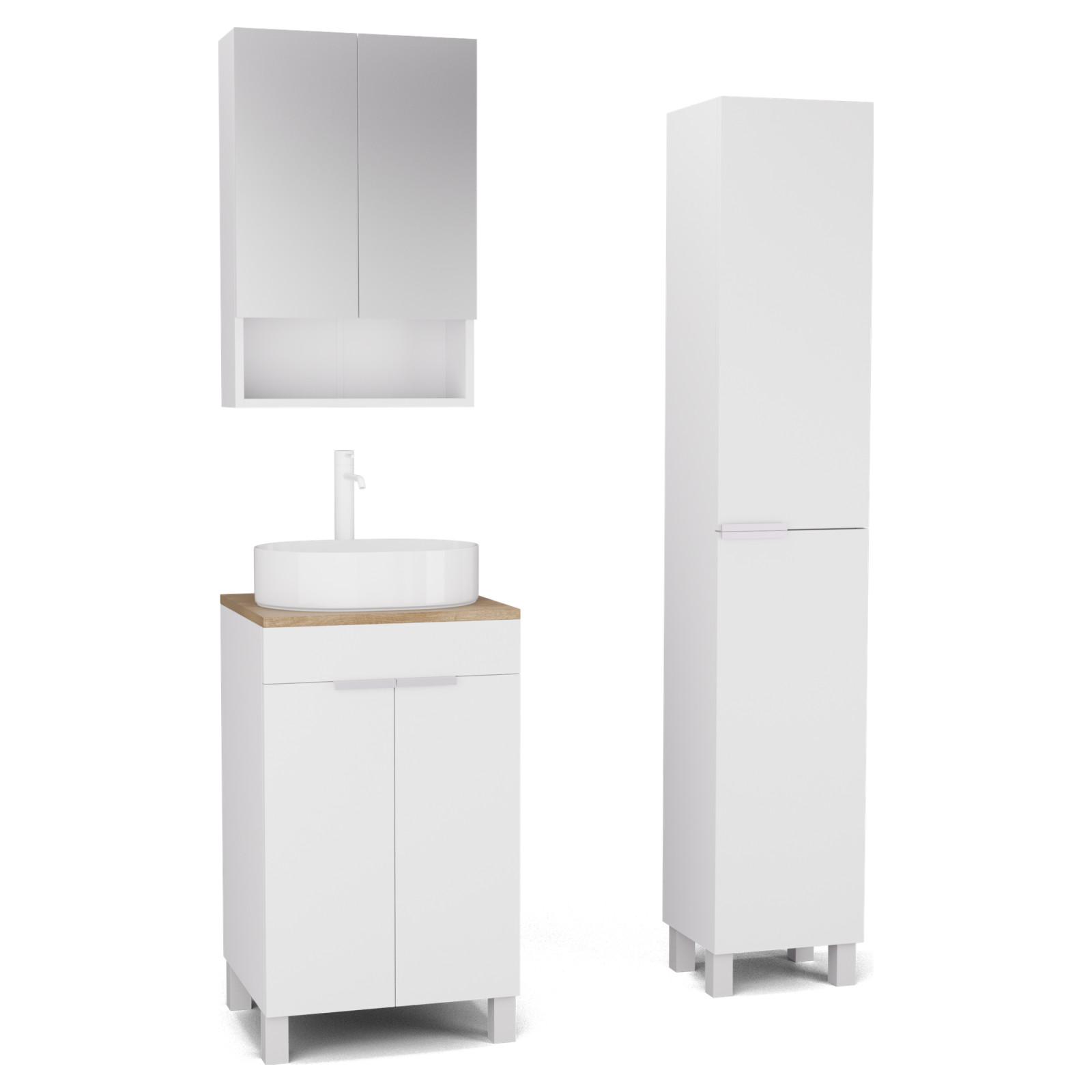 Saját márkás 60 cm széles komplett fürdőszoba bútor álló mosdószekrénnyel matt fehér színben, matt fehér fogantyúkkal és lábakkal, tölgyfa színű mosdópulttal, tükrös szekrénnyel és magasszekrénnyel.