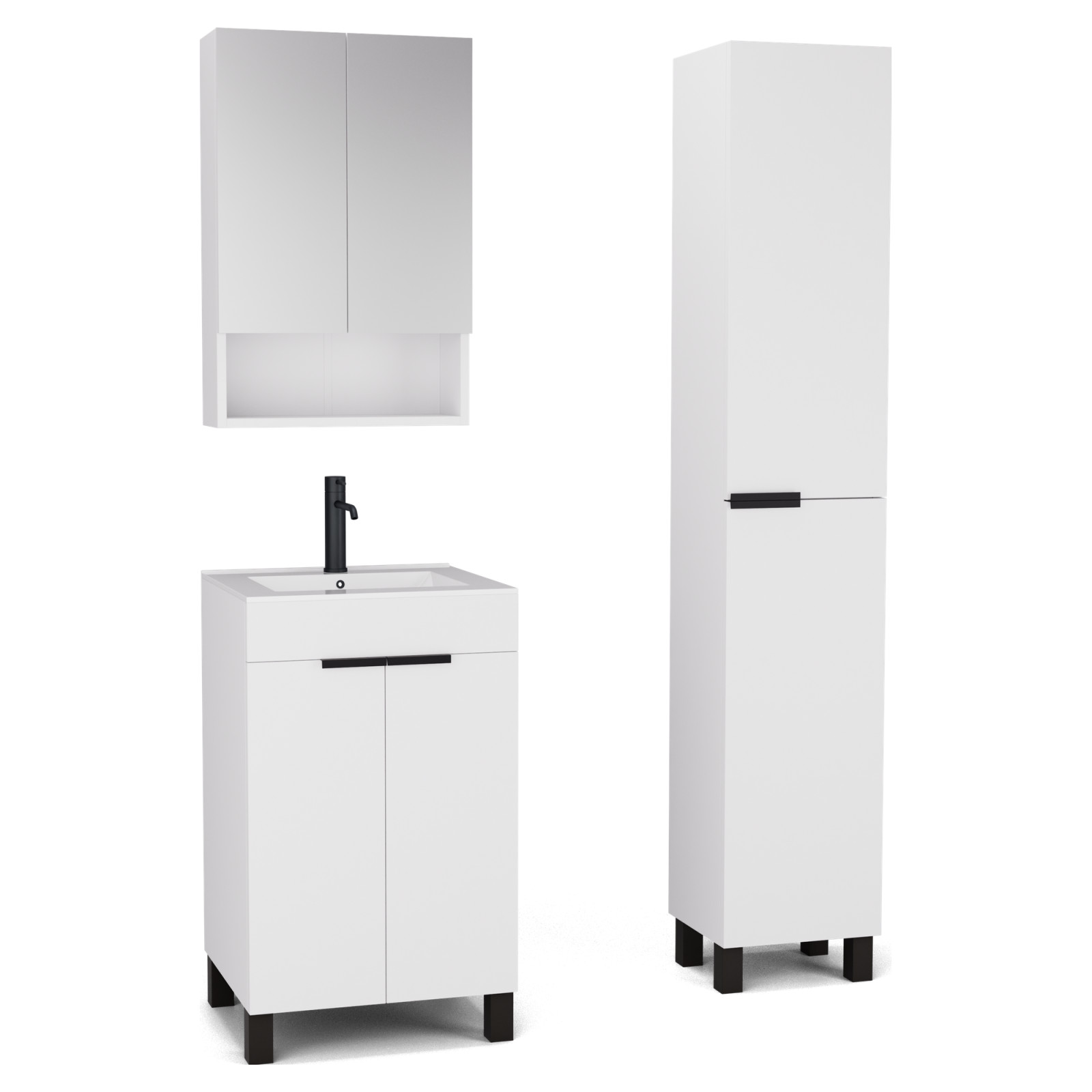 Saját márkás 50 cm széles komplett fürdőszoba bútor álló mosdószekrénnyel matt fehér színben, matt fekete fogantyúkkal és lábakkal, tükrös szekrénnyel és magasszekrénnyel.