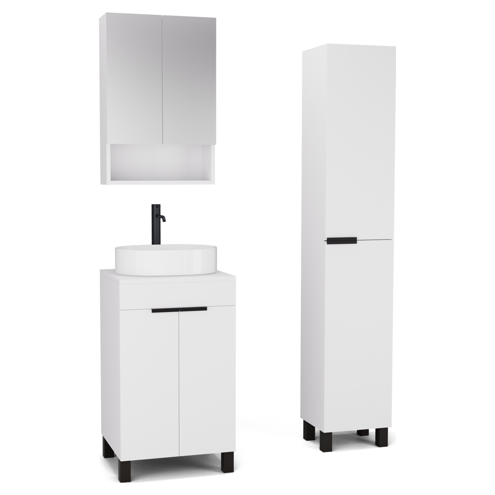 Saját márkás 50 cm széles komplett fürdőszoba bútor álló mosdószekrénnyel matt fehér színben, matt fekete fogantyúkkal és lábakkal, matt fehér színű mosdópulttal, tükrös szekrénnyel és magasszekrénnyel.